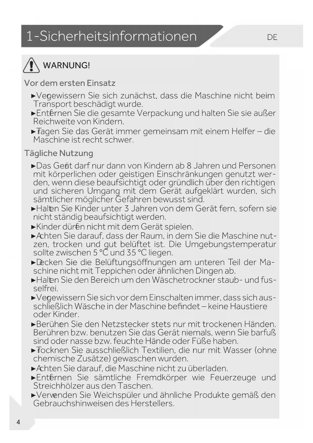WARNUNG! Vor dem ersten Einsatz ▶ Ver gewissern Sie sich zunächst, dass die Maschine nicht beim Transport beschädigt wurde. ▶ Entf ernen Sie die gesamte Verpackung und halten Sie sie außer Reichweite von Kindern. ▶ T ragen Sie das Gerät immer gemeinsam mit einem Helfer – die Maschine ist recht schwer. Tägliche Nutzung ▶ Das Ger ät darf nur dann von Kindern ab 8 Jahren und Personen mit körperlichen oder geistigen Einschränkungen genutzt wer- den, wenn diese beaufsichtigt oder gründlich über den richtigen und sicheren Umgang mit dem Gerät aufgeklärt wurden, sich sämtlicher möglicher Gefahren bewusst sind. ▶ Halt en Sie Kinder unter 3 Jahren von dem Gerät fern, sofern sie nicht ständig beaufsichtigt werden. ▶ Kinder dürf en nicht mit dem Gerät spielen. ▶ A chten Sie darauf, dass der Raum, in dem Sie die Maschine nut- zen, trocken und gut belüftet ist. Die Umgebungstemperatur sollte zwischen 5 °C und 35 °C liegen. ▶ D ecken Sie die Belüftungsönungen am unteren Teil der Ma- schine nicht mit Teppichen oder ähnlichen Dingen ab. ▶ Halt en Sie den Bereich um den Wäschetrockner staub- und fus- selfrei. ▶ Ver gewissern Sie sich vor dem Einschalten immer, dass sich aus- schließlich Wäsche in der Maschine bendet – keine Haustiere oder Kinder. ▶ Berühr en Sie den Netzstecker stets nur mit trockenen Händen. Berühren bzw. benutzen Sie das Gerät niemals, wenn Sie barfuß sind oder nasse bzw. feuchte Hände oder Füße haben. ▶ T rocknen Sie ausschließlich Textilien, die nur mit Wasser (ohne chemische Zusätze) gewaschen wurden. ▶ A chten Sie darauf, die Maschine nicht zu überladen. ▶ Entf ernen Sie sämtliche Fremdkörper wie Feuerzeuge und Streichhölzer aus den Taschen. ▶ Verw enden Sie Weichspüler und ähnliche Produkte gemäß den Gebrauchshinweisen des Herstellers.DE