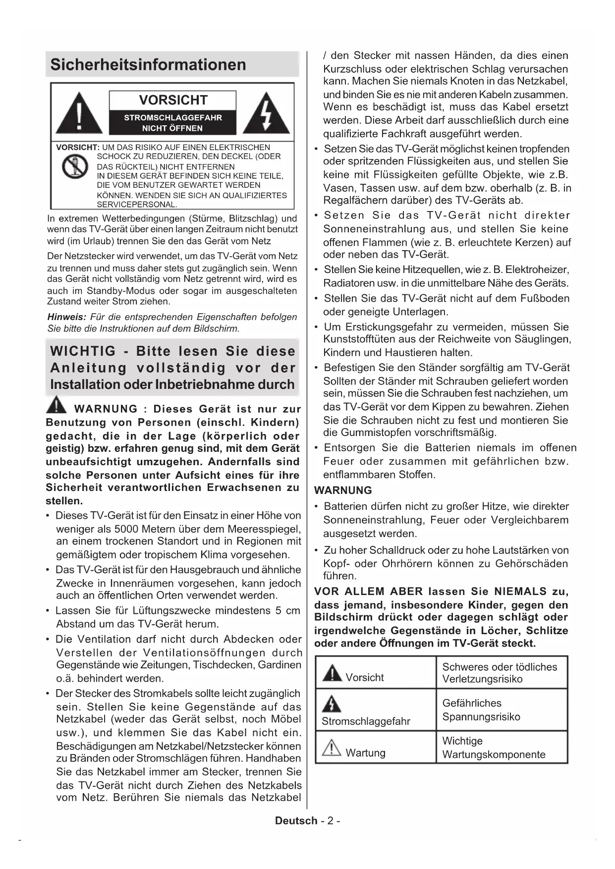 - Zu hoher Schalldruck oder zu hohe Lautstärken von Kopf- oder Ohrhörern können zu Gehörschäden führen. VOR ALLEM ABER lassen Sie NIEMALS zu, dass jemand, insbesondere Kinder, gegen den Bildschirm drückt oder dagegen schlägt oder irgendwelche Gegenstände in Löcher, Schlitze oder andere Önungen im TV-Gerät steckt. Vorsicht Schweres oder tödliches Verletzungsrisiko Stromschlaggefahr Gefährliches Spannungsrisiko Wartung Wichtige WartungskomponenteDeutsch - 3 - Kennzeichnungen auf dem Gerät Die folgenden Symbole werden auf dem Gerät als Kennzeichnungen für Einschränkungen und Vorsichtsmaßnahmen sowie Sicherheitshinweise