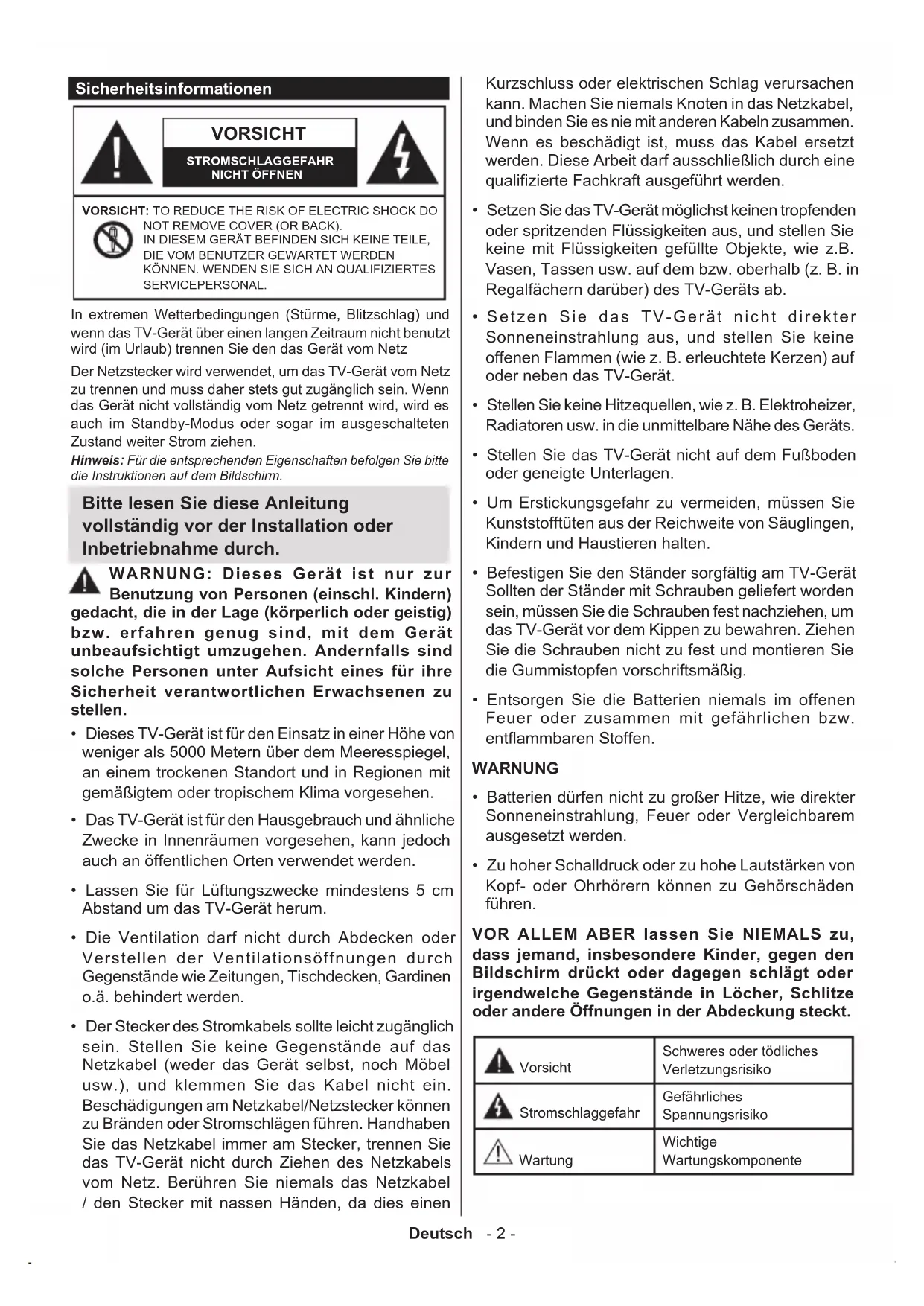 KÖNNEN. WENDEN SIE SICH AN QUALIFIZIERTES SERVICEPERSONAL. Hinweis: Für die entsprechenden Eigenschaften befolgen Sie bitte die Instruktionen auf dem Bildschirm. In extremen Wetterbedingungen (Stürme, Blitzschlag) und wenn das TV-Gerät über einen langen Zeitraum nicht benutzt wird (im Urlaub) trennen Sie den das Gerät vom Netz Der Netzstecker wird verwendet, um das TV-Gerät vom Netz zu trennen und muss daher stets gut zugänglich sein. Wenn das Gerät nicht vollständig vom Netz getrennt wird, wird es auch im Standby-Modus oder sogar im ausgeschalteten Zustand weiter Strom ziehen. Bitte lesen Sie diese Anleitung vollständig vor der Installation oder Inbetriebnahme durch. WARNUNG: Dieses Gerät ist nur zur Benutzung von Personen (einschl. Kindern) gedacht, die in der Lage (körperlich oder geistig) bzw. erfahren genug sind, mit dem Gerät unbeaufsichtigt umzugehen. Andernfalls sind solche Personen unter Aufsicht eines für ihre Sicherheit verantwortlichen Erwachsenen zu stellen.