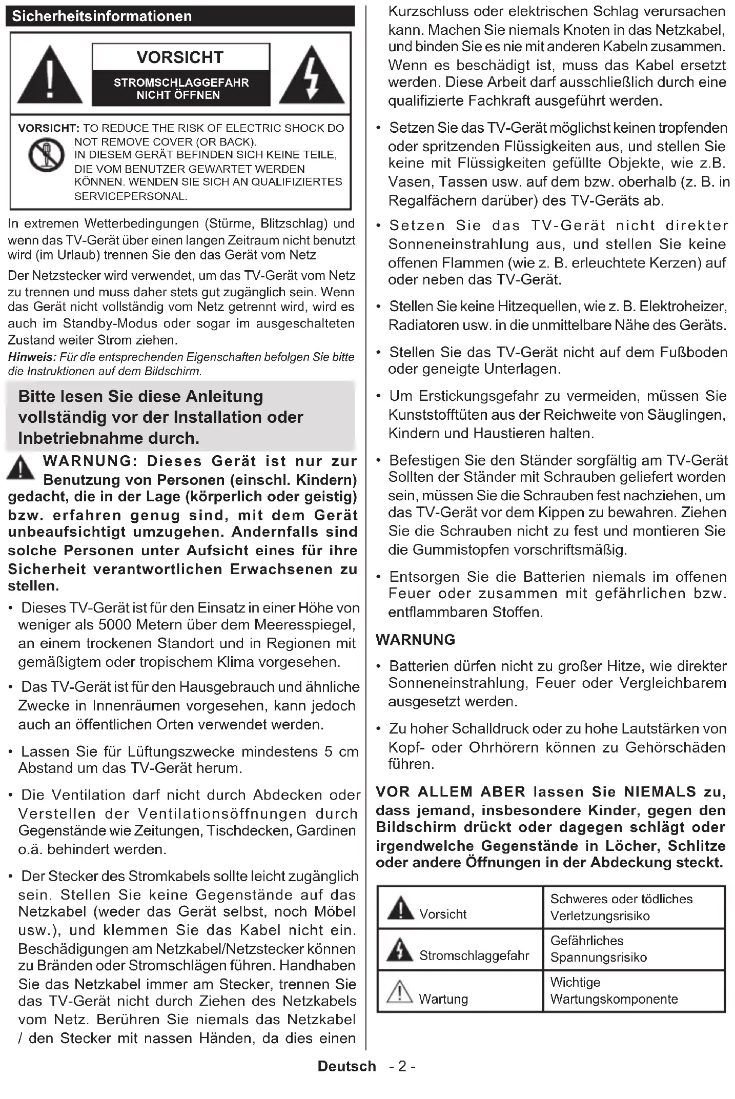 KÖNNEN. WENDEN SIE SICH AN QUALIFIZIERTES SERVICEPERSONAL. Hinweis: Für die entsprechenden Eigenschaften befolgen Sie bitte die Instruktionen auf dem Bildschirm. In extremen Wetterbedingungen (Stürme, Blitzschlag) und wenn das TV-Gerät über einen langen Zeitraum nicht benutzt wird (im Urlaub) trennen Sie den das Gerät vom Netz Der Netzstecker wird verwendet, um das TV-Gerät vom Netz zu trennen und muss daher stets gut zugänglich sein. Wenn das Gerät nicht vollständig vom Netz getrennt wird, wird es auch im Standby-Modus oder sogar im ausgeschalteten Zustand weiter Strom ziehen. Bitte lesen Sie diese Anleitung vollständig vor der Installation oder Inbetriebnahme durch. WARNUNG: Dieses Gerät ist nur zur Benutzung von Personen (einschl. Kindern) gedacht, die in der Lage (körperlich oder geistig) bzw. erfahren genug sind, mit dem Gerät unbeaufsichtigt umzugehen. Andernfalls sind solche Personen unter Aufsicht eines für ihre Sicherheit verantwortlichen Erwachsenen zu stellen.