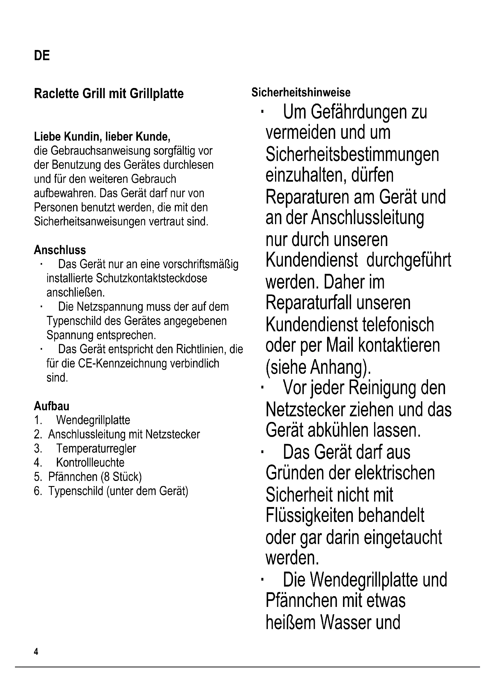 AC 220 – 240 V~ 50 – 60 Hz Schutzklasse / Protection class / Classe de protection / Veiligheidsklasse / Grado de protección / Classe di protezione / Beskyttelsesklasse / Skyddsklass / Kotelointiluokka / Classe de proteção / Stopień ochrony / Κατηγορία προστασίας : 1 Gewicht / Weight / Poids / Gewicht / Peso / Peso / Vægt / Vikt / Paino / Peso / Waga / Βάρος : 4 kg Maße Grilläche / Grill surface dimensions / Dimensions de la plaque de cuisson / Afmetingen grillvlak / Dimensiones de la supercie de la parrilla / Dimensioni della supercie di grigliatura / Grilladens mål / Mått grillyta / Grillitason mitat / Dimensões da superfície do grelhador / Wymiary powierzchni grilla / Διαστάσεις επιφάνειας ψησίματος : 485 x 240 mm4 104 x 142 mm Raclette Grill mit Grillplatte Liebe Kundin, lieber Kunde, die Gebrauchsanweisung sorgfältig vor der Benutzung des Gerätes durchlesen und für den weiteren Gebrauch aufbewahren. Das Gerät darf nur von Personen benutzt werden, die mit den Sicherheitsanweisungen vertraut sind. Anschluss ∙ Das Gerät nur an eine vorschriftsmäßig installierte Schutzkontaktsteckdose anschließen. ∙ Die Netzspannung muss der auf dem Typenschild des Gerätes angegebenen Spannung entsprechen. ∙ Das Gerät entspricht den Richtlinien, die für die CE-Kennzeichnung verbindlich sind. Aufbau