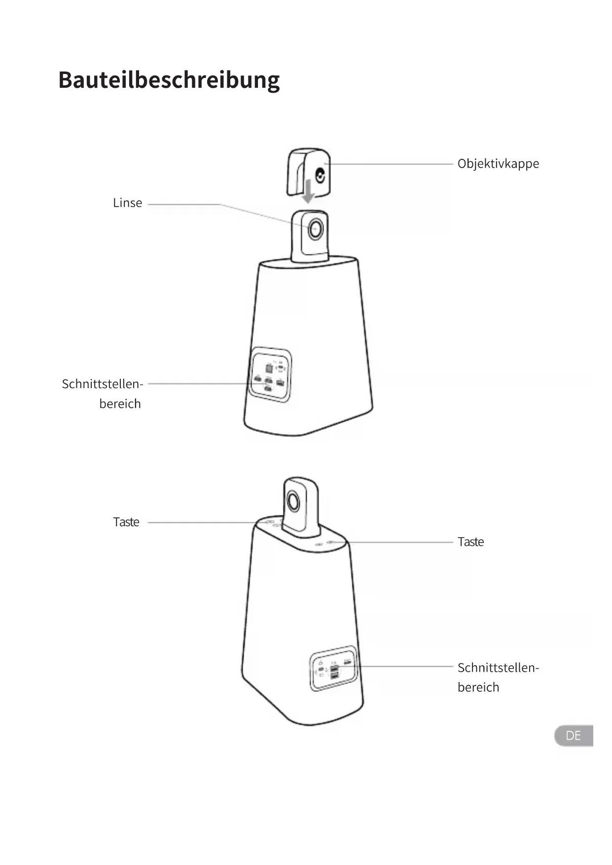 Bauteilbeschreibung Objektivkappe Linse Taste Schnittstellen- bereich Taste Schnittstellen- bereichDE Beschreibung der Tasten Modus-Taste Tasten zur Lautstärkeerhöhung/ -Verringerung Stummschaltungs-Taste Hauptschalter Mit kurzem Drücken öffnet sich ein Pop-up-Fenster, in dem nach der Option "Ausschalten"/"Neustart" gefragt wird, und der Countdown wird gestartet. Mit erneutem kurzen Drücken wird das Gerät ausges- chaltet. Lautstärke des Lautsprechers einstellen Kurz drücken, um das Mikrofon stumm zu schalten Mit kurzem Drücken wird der Bildschirmmodus umgeschaltet -Sekunden lang drücken, um den Blickwinkel des Bildschirms zu sperrenDE Beschreibungen der Kontrollleuchten Grünes Licht blinkt Das Gerät wird eingeschaltet oder das Systemupgrade ist im Gange Grünes Licht dauerhaft an Bereit Blaues Licht blinkt Aufnahme ist im Gange Blaues Licht dauerhaft an Die Kamera arbeitet derzeit gerade Rotes Licht dauerhaft an Das Mikrofon ist stummges- chaltetDE Beschreibung der Schnittstelle Ethernet-Anschluss USB-C Netzteil HDMI EIN USB-A Port HDMI AUS Zum Anschluss an dem Monitor/ TV für Bildausgabe Zum Anschluss an einer Maus oder Tastatur Es versorgt das Gerät mit Strom über ein Stromadapter und ein Netzkabel Er verbindet sich über eine kabelge- bundene Verbindung mit Ethernet und kann gleichzeitig Geräte über Ethernet (PoE) mit Strom versorgen Zum Anschluss an dem Computer für Videoeingabe, um den Bildschirminhalt des externen Computers zu teilen Zur Diebstahlsicherung von Geräten Zur Diebstahlsicherung von GerätenDE