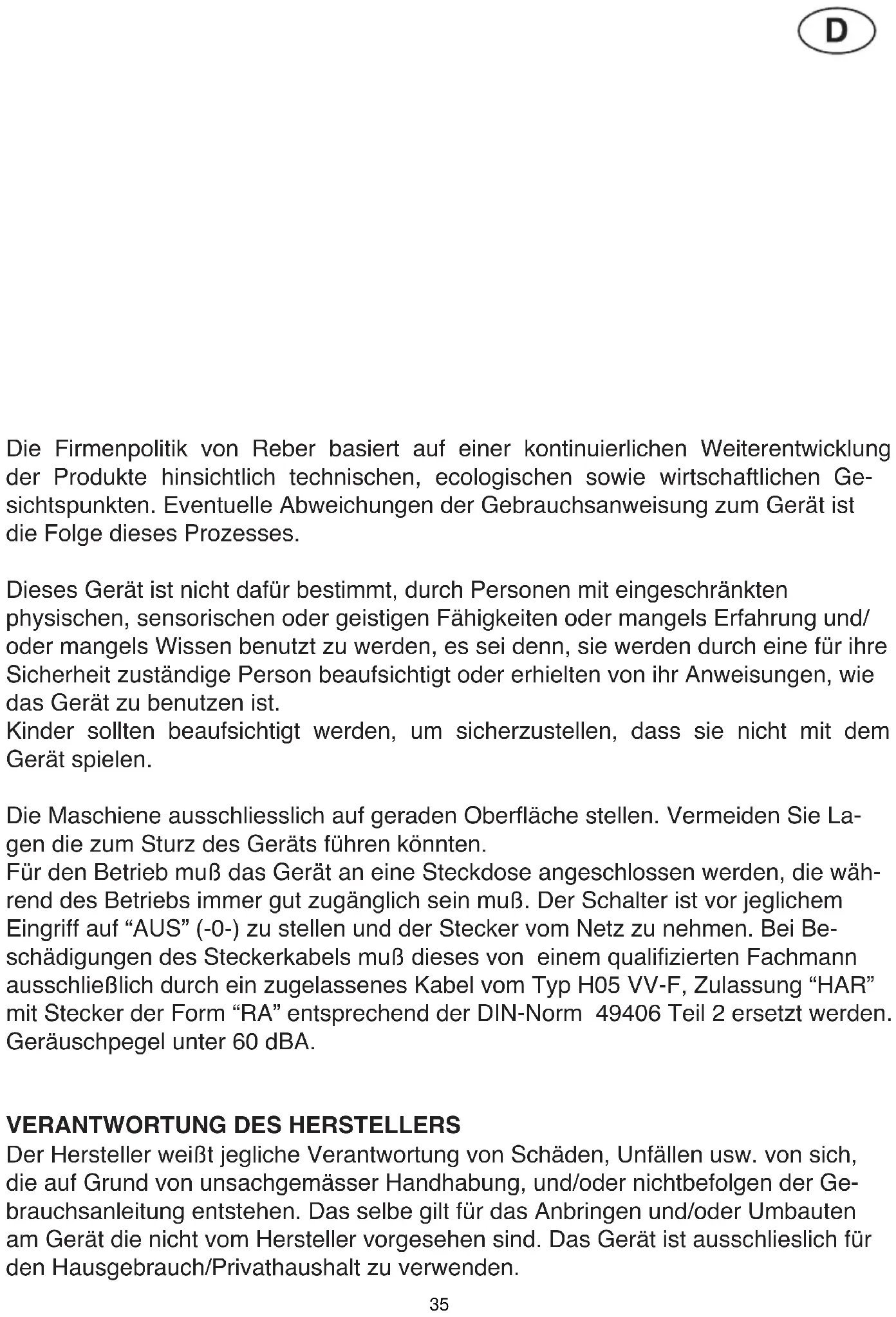 Switch off the motor and disconnect the plug from the socket. Introduce the screw (8) into the casing (7), making sure that its square part goes out of the rear hole of the casing. Insert the reduction gear (12) into the square part of the screw (8) (only in model N.5).Insert the die plate (9) so that the larger base goes into the casing (7) mouth. Screw the ring nut (11) on the casing (7) mouth by rotating it in clockwise di- rection as long as it is locked.Couple the press to the geared motor having the screw square part inserted in the square seat of the geared motor. Tighten the stop nuts. WARNINGS - Before carrying out assembly, disassembly, die plate replacement and cleaning operations, switch off the motor and disconnect the cable with plug, to avoid risks of electric shock. - Do not press the dough into the unit with your hands; use the specially-supplied pestle. - After every use disassemble, wash and dry all press parts carefully. - Clean the die plates by putting them in a warm water bath immediately after use. - Before use, warm the die plates in warm water (cold die plates produce irregularly- shaped pasta) - The pasta obtained can show a darker or lighter colour, according to the amount of pressure applied when coming out of the unit. When pressure is lower, lighter pasta will be produced (this happens, for example, when the dough is introduced into the press too slowly compared with the capacity of the unit). This does not alter pasta quality and features. - In case of blockage of the press, disconnect the plug cable from the socket imme- diatly to avoid risks of damage the machine. - Close supervision is required when this product is used near children. 34Die Firmenpolitik von Reber basiert auf einer kontinuierlichen Weiterentwicklung der Produkte hinsichtlich technischen, ecologischen sowie wirtschaftlichen Ge- sichtspunkten. Eventuelle Abweichungen der Gebrauchsanweisung zum Gerät ist die Folge dieses Prozesses. Dieses Gerät ist nicht dafür bestimmt, durch Personen mit eingeschränkten physischen, sensorischen oder geistigen Fähigkeiten oder mangels Erfahrung und/ oder mangels Wissen benutzt zu werden, es sei denn, sie werden durch eine für ihre Sicherheit zuständige Person beaufsichtigt oder erhielten von ihr Anweisungen, wie das Gerät zu benutzen ist. Kinder sollten beaufsichtigt werden, um sicherzustellen, dass sie nicht mit dem Gerät spielen. Die Maschiene ausschliesslich auf geraden Oberäche stellen. Vermeiden Sie La- gen die zum Sturz des Geräts führen könnten. Für den Betrieb muß das Gerät an eine Steckdose angeschlossen werden, die wäh- rend des Betriebs immer gut zugänglich sein muß. Der Schalter ist vor jeglichem Eingriff auf “AUS” (-0-) zu stellen und der Stecker vom Netz zu nehmen. Bei Be- schädigungen des Steckerkabels muß dieses von einem qualizierten Fachmann ausschließlich durch ein zugelassenes Kabel vom Typ H05 VV-F, Zulassung “HAR” mit Stecker der Form “RA” entsprechend der DIN-Norm 49406 Teil 2 ersetzt werden. Geräuschpegel unter 60 dBA.