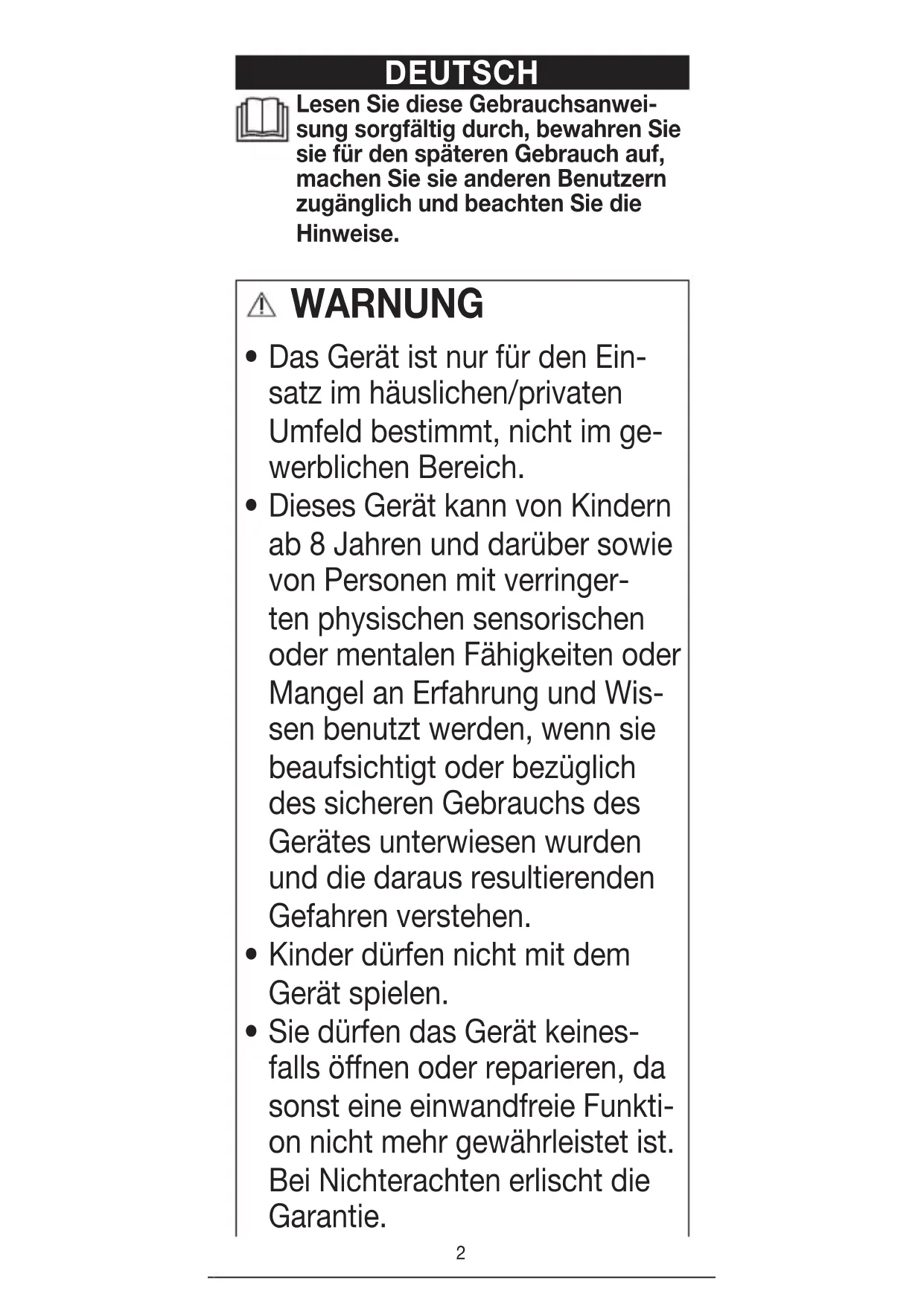 Das Gerät ist nur für den Ein- satz im häuslichen/privaten Umfeld bestimmt, nicht im ge- werblichen Bereich.