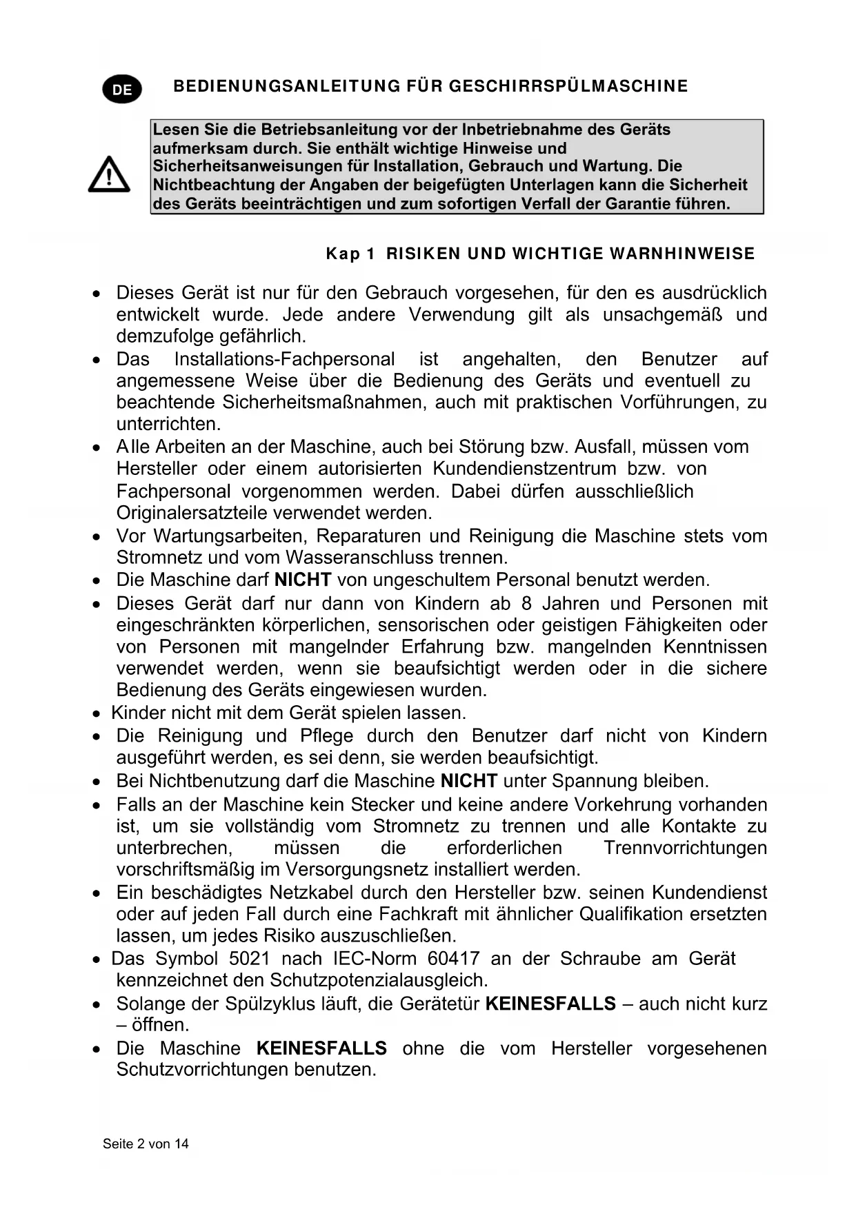 lle Arbeiten an der Maschine, auch bei Störung bzw. Ausfall, müssen vom Hersteller oder einem autorisierten Kundendienstzentrum bzw. von Fachpersonal vorgenommen werden. Dabei dürfen ausschließlich Originalersatzteile verwendet werden. Vor Wartungsarbeiten, Reparaturen und Reinigung die Maschine stets vom Stromnetz und vom Wasseranschluss trennen. Die Maschine darf NICHT von ungeschultem Personal benutzt werden. Dieses Gerät darf nur dann von Kindern ab 8 Jahren und Personen mit eingeschränkten körperlichen, sensorischen oder geistigen Fähigkeiten oder von Personen mit mangelnder Erfahrung bzw. mangelnden Kenntnissen verwendet werden, wenn sie beaufsichtigt werden oder in die sichere Bedienung des Geräts eingewiesen wurden. Kinder nicht mit dem Gerät spielen lassen. Die Reinigung und Pflege durch den Benutzer darf nicht von Kindern ausgeführt werden, es sei denn, sie werden beaufsichtigt. Bei Nichtbenutzung darf die Maschine NICHT unter Spannung bleiben. Falls an der Maschine kein Stecker und keine andere Vorkehrung vorhanden ist, um sie vollständig vom Stromnetz zu trennen und alle Kontakte zu unterbrechen, müssen die erforderlichen Trennvorrichtungen vorschriftsmäßig im Versorgungsnetz installiert werden. Ein beschädigtes Netzkabel durch den Hersteller bzw. seinen Kundendienst oder auf jeden Fall durch eine Fachkraft mit ähnlicher Qualifikation ersetzten lassen, um jedes Risiko auszuschließen. Das Symbol 5021 nach IEC-Norm 60417 an der Schraube am Gerät kennzeichnet den Schutzpotenzialausgleich. Solange der Spülzyklus läuft, die Gerätetür KEINESFALLS – auch nicht kurz – öffnen. Die Maschine KEINESFALLS ohne die vom Hersteller vorgesehenen Schutzvorrichtungen benutzen.BEDIENUNGSANLEITUNG FÜR GESCHIRRSPÜLMASCHINE Seite 3 von 14
