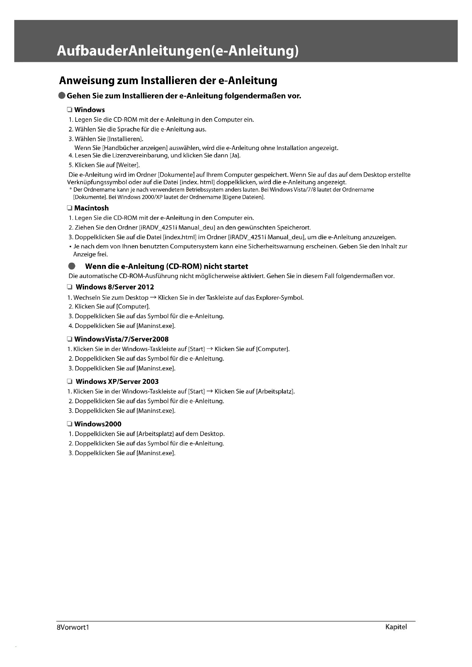 - Der Ordnername kann je nach verwendetem Betriebssystem anders lauten. Bei Windows Vista/7/8 lautet der Ordnername [Dokumente]. Bei Windows 2000/XP lautet der Ordnername [Eigene Dateien]. ❏ Macintosh 1. Legen Sie die CD-ROM mit der e-Anleitung in den Computer ein. 2. Ziehen Sie den Ordner [iRADV_4251i Manual_deu] an den gewünschten Speicherort. 3. Doppelklicken Sie auf die Datei [index.html] im Ordner [iRADV_4251i Manual_deu], um die e-Anleitung anzuzeigen.
