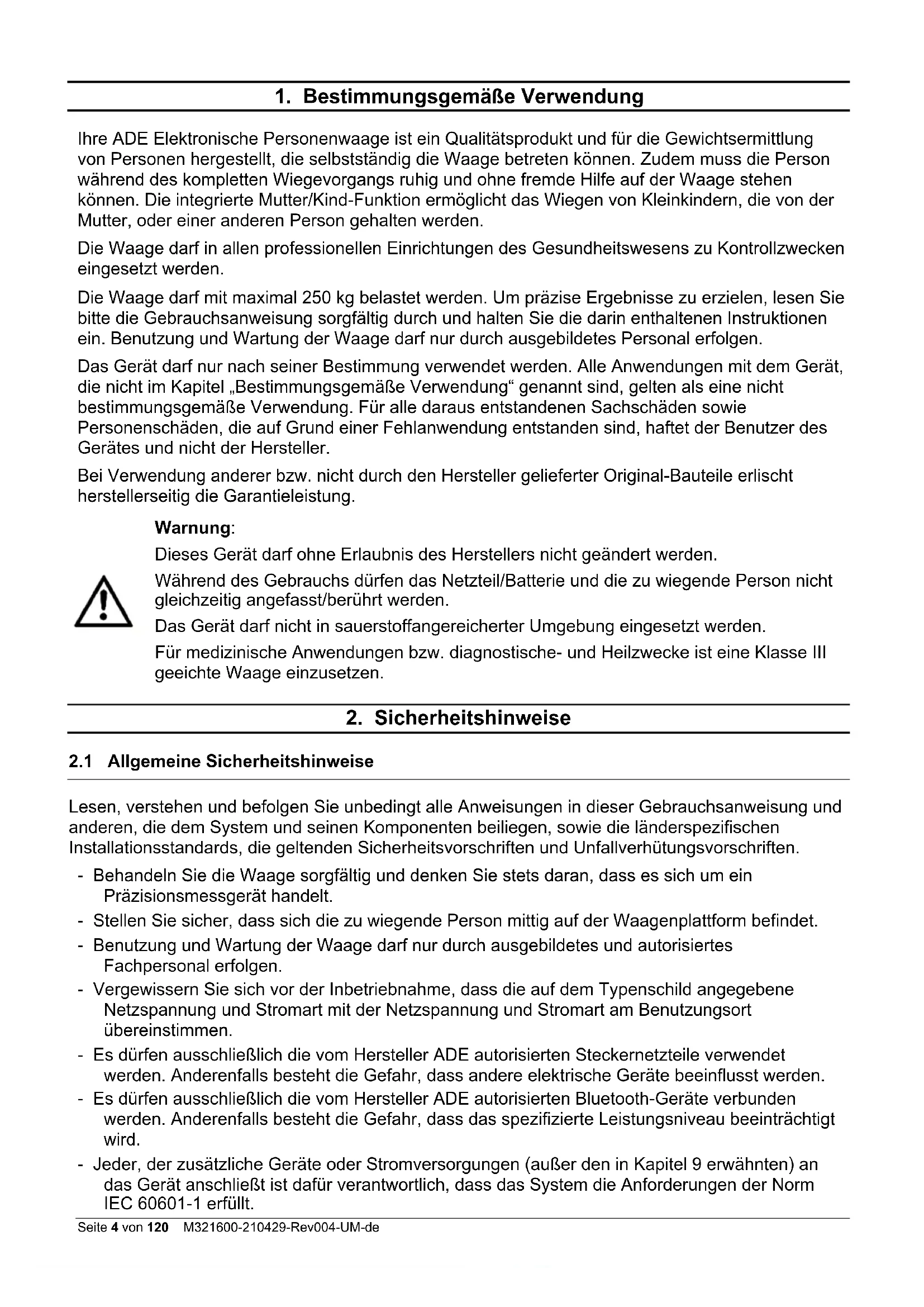 Lesen, verstehen und befolgen Sie unbedingt alle Anweisungen in dieser Gebrauchsanweisung und anderen, die dem System und seinen Komponenten beiliegen, sowie die länderspezifischen Installationsstandards, die geltenden Sicherheitsvorschriften und Unfallverhütungsvorschriften. - Behandeln Sie die Waage sorgfältig und denken Sie stets daran, dass es sich um ein Präzisionsmessgerät handelt. - Stellen Sie sicher, dass sich die zu wiegende Person mittig auf der Waagenplattform befindet. - Benutzung und Wartung der Waage darf nur durch ausgebildetes und autorisiertes Fachpersonal erfolgen. - Vergewissern Sie sich vor der Inbetriebnahme, dass die auf dem Typenschild angegebene Netzspannung und Stromart mit der Netzspannung und Stromart am Benutzungsort übereinstimmen. - Es dürfen ausschließlich die vom Hersteller ADE autorisierten Steckernetzteile verwendet werden. Anderenfalls besteht die Gefahr, dass andere elektrische Geräte beeinflusst werden. - Es dürfen ausschließlich die vom Hersteller ADE autorisierten Bluetooth-Geräte verbunden werden. Anderenfalls besteht die Gefahr, dass das spezifizierte Leistungsniveau beeinträchtigt wird. - Jeder, der zusätzliche Geräte oder Stromversorgungen (außer den in Kapitel 9 erwähnten) an das Gerät anschließt ist dafür verantwortlich, dass das System die Anforderungen der Norm IEC 60601-1 erfüllt.M321600-210429-Rev004-UM-de Seite 5 von 120 - Der Stecker/Adapterstecker isoliert das Gerät vom Stromnetz. Stellen Sie das Gerät nicht in einer Position auf, in der es schwierig ist, die Verbindung zum Stromnetz zu trennen, um den Betrieb des Geräts sicher zu beenden. - Verlegen Sie das Anschlusskabel zwischen Waage und Netzanschluss so, dass es nicht zur Stolperfalle werden kann. - Verlegen Sie das Anschlusskabel zwischen Waage und Netzanschluss so, dass von ihm keine Gefahr durch Strangulation ausgehen kann. - Waage niemals auf der Stellfläche hin- und herschieben, da dies zur Beschädigung der Wägezellen führen kann. - Betreiben Sie das Gerät nur innerhalb der zulässigen Umgebungsbedingungen. - Setzen Sie die Waage keinen hohen Temperaturen aus, sei es durch nebenstehende Geräte oder durch Sonneneinstrahlung. Die Flüssigkristall-Anzeige könnte darunter leiden. - Verwenden Sie die Waage bei gleichbleibenden Umgebungstemperaturen und vermeiden Sie den Einsatz in Zugluft, da sonst die Messergebnisse verfälscht werden könnten. - Nach der Lagerung unter extremen Bedingungen sind mindestens 60 Minuten erforderlich, bis sich die Waage akklimatisiert hat und für den bestimmungsgemäßen Gebrauch bereit ist. - Stellen Sie die Waage möglichst entfernt von anderen Geräten oder Quellen auf, die elektromagnetische oder andere Störungen erzeugen, da diese die Messergebnisse verfälschen können. - Verwenden Sie ausschließlich zugelassenes Zubehör und Peripheriegeräte. - Ziehen Sie vor der Reinigung des Gerätes das Netzteil aus der Steckdose. - Tauchen Sie das Gerät nicht in Wasser oder andere Flüssigkeiten. - Wird die Waage über einen längeren Zeitraum nicht genutzt, sollte sie gereinigt und in einer Schutzfolie gelagert werden. Die Zugabe eines Trockenmittels ist wünschenswert. - Entfernen Sie die Batterien, wenn Sie die Waage über einen längeren Zeitraum nicht nutzen. - Wenn Sie Probleme mit diesem Gerät haben, z.B. bei der Einrichtung, Wartung oder Verwendung, wenden Sie sich bitte an den autorisierten Kundendienst. Öffnen oder reparieren Sie das Gerät nicht selbst. - Bitte benachrichtigen Sie den autorisierten Kundendienst, wenn unerwartete Operationen oder Ereignisse auftreten. Benutzen Sie die Waage NICHT: - wenn das Netzteil beschädigt ist; - wenn das Netzteil nicht funktioniert; - wenn sich das Batteriefach unnatürlich wölbt; - nach langer Einlagerung in feuchter Umgebung. Wenden Sie sich in diesen Fällen an den autorisierten Kundendienst.Seite 6 von 120 M321600-210429-Rev004-UM-de