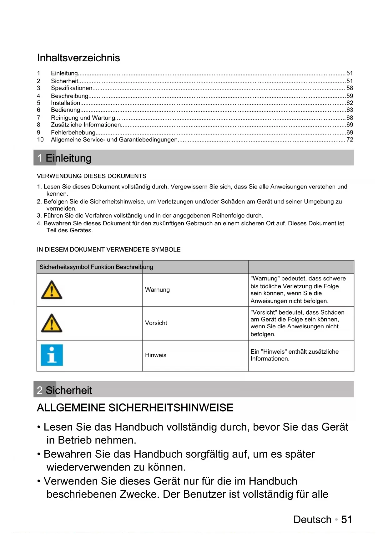 - Lesen Sie das Handbuch vollständig durch, bevor Sie das Gerät in Betrieb nehmen.