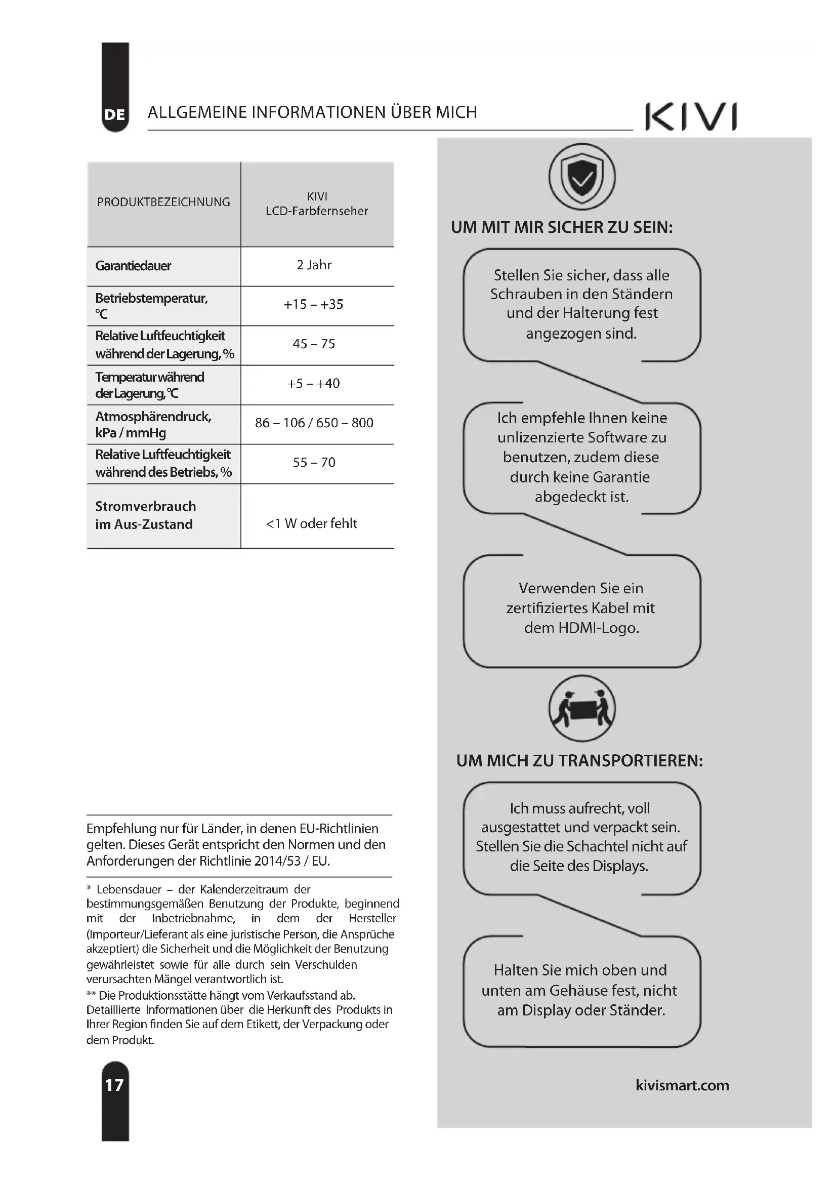 - Lebensdauer – der Kalenderzeitraum der bestimmungsgemäßen Benutzung der Produkte, beginnend mit der Inbetriebnahme, in dem der Hersteller (Importeur/Lieferant als eine juristische Person, die Ansprüche akzeptiert) die Sicherheit und die Möglichkeit der Benutzung gewährleistet sowie für alle durch sein Verschulden verursachten Mängel verantwortlich ist. ** Die Produktionsstätte hängt vom Verkaufsstand ab. Detaillierte Informationen über die Herkunft des Produkts in Ihrer Region finden Sie auf dem Etikett, der Verpackung oder dem Produkt. Empfehlung nur für Länder, in denen EU-Richtlinien gelten. Dieses Gerät entspricht den Normen und den Anforderungen der Richtlinie 2014/53 / EU. UM MICH ZU TRANSPORTIEREN: Ich muss aufrecht, voll ausgestattet und verpackt sein. Stellen Sie die Schachtel nicht auf die Seite des Displays. Halten Sie mich oben und unten am Gehäuse fest, nicht am Display oder Ständer. Verwenden Sie ein zertifiziertes Kabel mit dem HDMI-Logo. Ich empfehle Ihnen keine unlizenzierte Software zu benutzen, zudem diese durch keine Garantie abgedeckt ist. Stellen Sie sicher, dass alle Schrauben in den Ständern und der Halterung fest angezogen sind. UM MIT MIR SICHER ZU SEIN: PRODUKTBEZEICHNUNG KIVI LCD-Farbfernseher Garantiedauer 2 Jahr Betriebstemperatur,