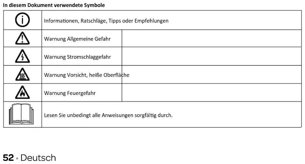 Informaonen, Ratschläge, Tipps oder Empfehlungen Warnung Allgemeine Gefahr Warnung Stromschlaggefahr Warnung Vorsicht, heiße Oberäche Warnung Feuergefahr Lesen Sie unbedingt alle Anweisungen sorgfälg durch.Deutsch • 53