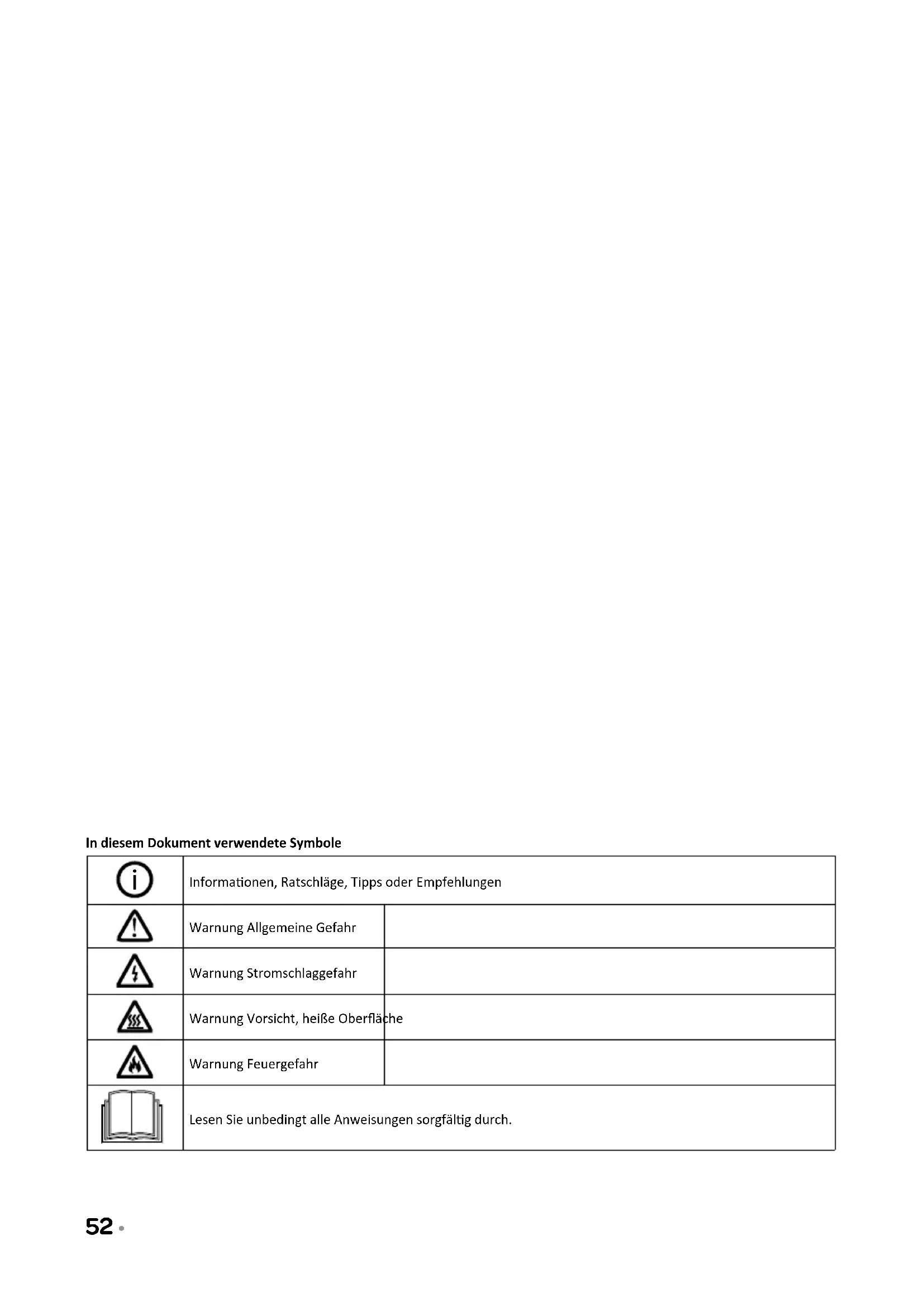 Informaonen, Ratschläge, Tipps oder Empfehlungen Warnung Allgemeine Gefahr Warnung Stromschlaggefahr Warnung Vorsicht, heiße Oberäche Warnung Feuergefahr Lesen Sie unbedingt alle Anweisungen sorgfälg durch.Deutsch • 53 Deutsch Sicherheitshinweise1