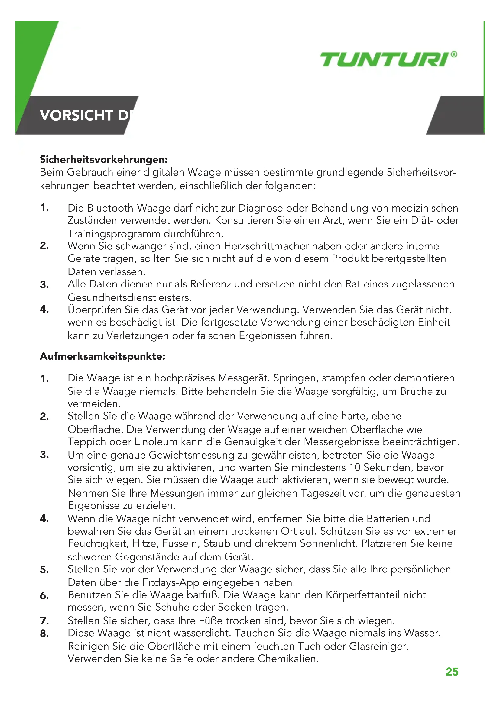Made in China © 2023 Tunturi New Fitness BV Alle rechten voorbehouden. Het product en de handleiding zijn aan wijzigingen onderhevig. Specificaties kunnen zonder voorafgaande kennisgeving worden gewijzigd. Tunturi New Fitness B.V. / P.O. Box 60001 / 1320 AA Almere / The Netherlands / www.tunturi.com 21BENUTZERHANDBUCH DEUTSCH Vielen Dank, dass Sie sich für die Tunturi Smart Scale entschieden haben! Diese Waage ist Ihr persönlicher Gesundheitsassistent. Sie verwendet die Bioelektrische Impedan- zanalyse (BIA)-Technologie, um Ihnen die Daten zur Verfügung zu stellen, die Sie benötigen, um Ihre persönlichen Gesundheitsmetriken im Auge zu behalten: BMI (Body Mass Index), Körperfettanteil, Körperwasser, Muskelmasse, Knochenmasse, Protein und vieles mehr! Hinweis: Das maximale Benutzergewicht beträgt 180 kg. 22PRODUKTSPEZIFIKATIONEN PRODUKTMERKMALE
