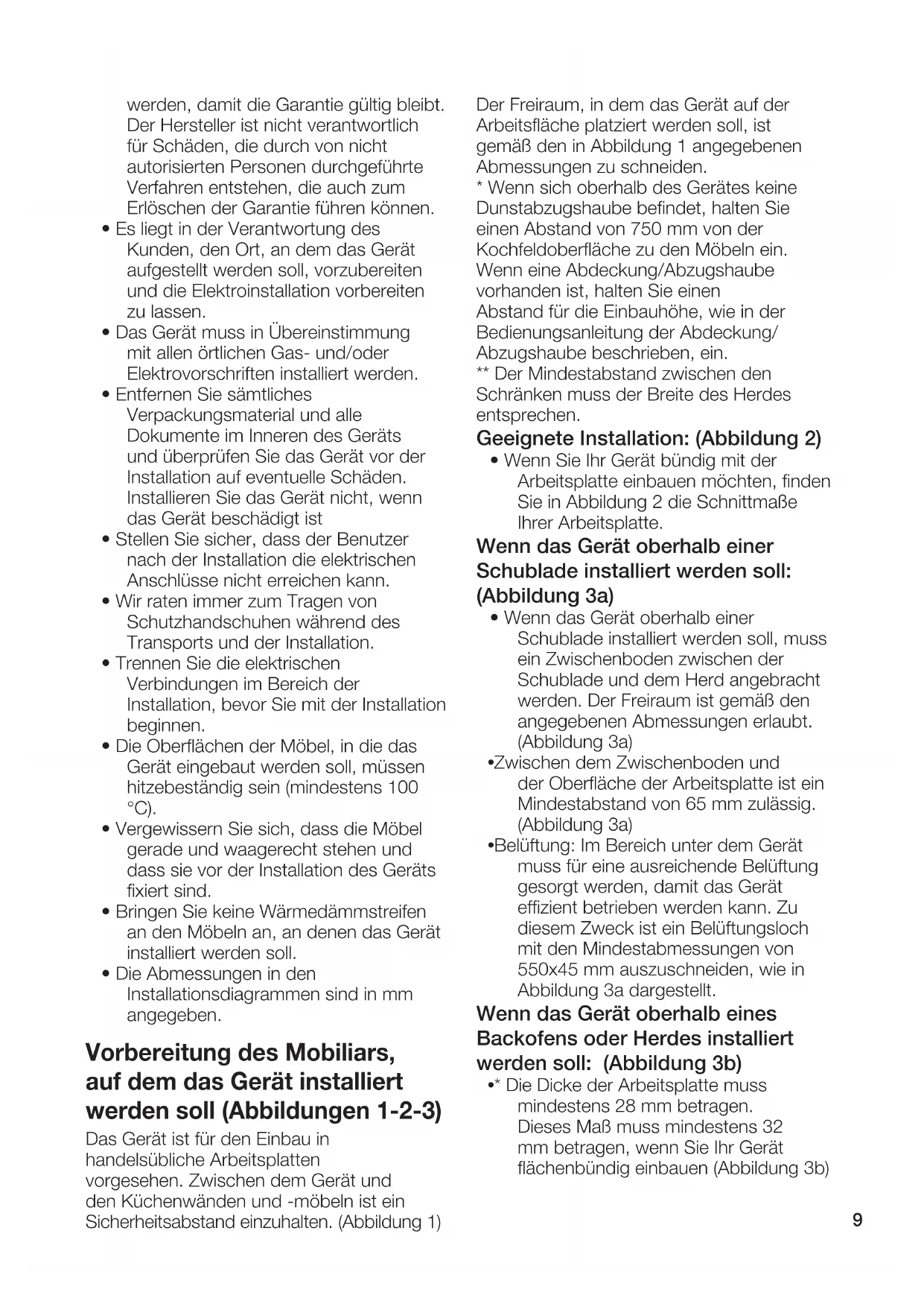 • Die Oberflächen der Möbel, in die das Gerät eingebaut werden soll, müssen hitzebeständig sein (mindestens 100 °C).