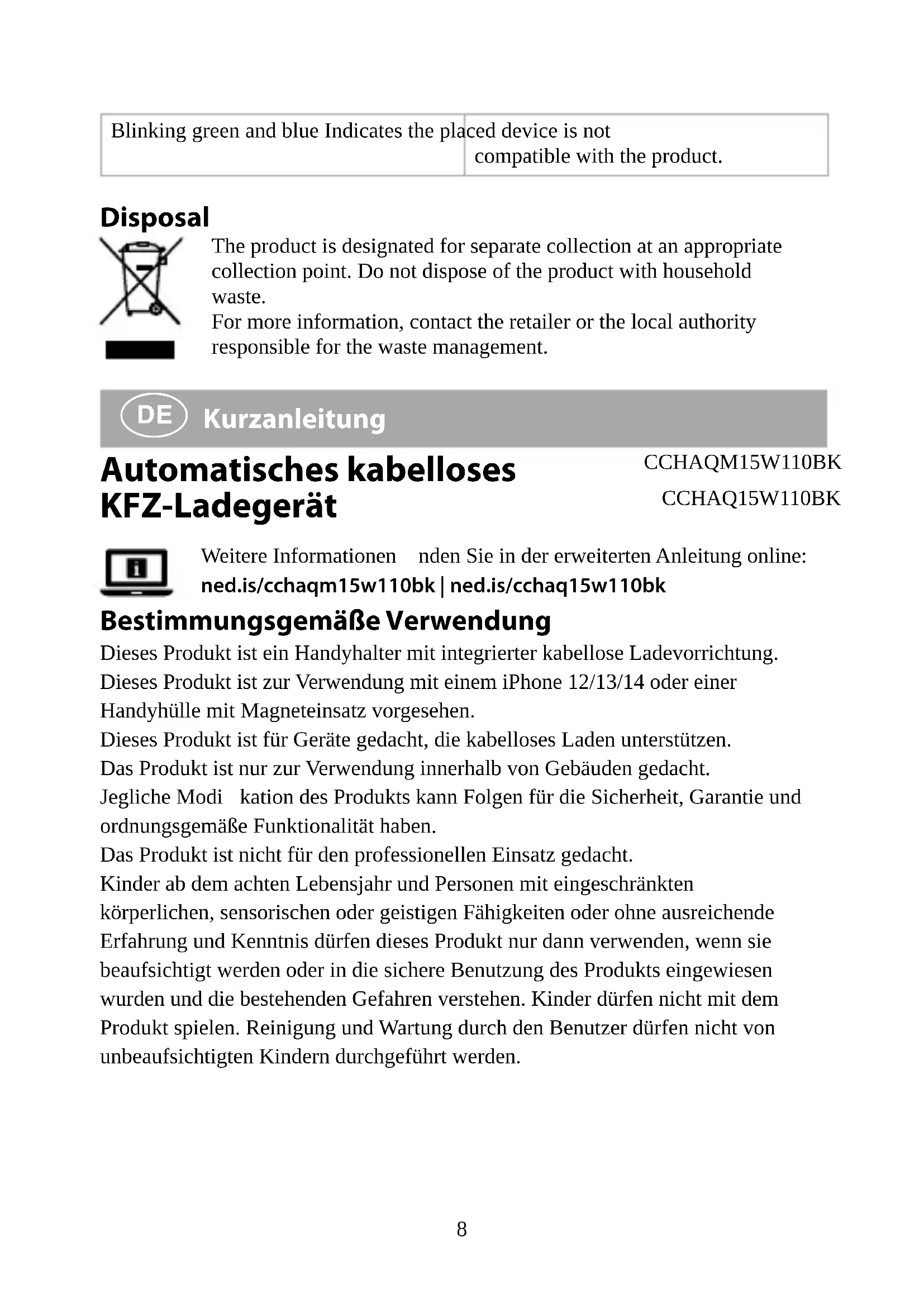 LED-Anzeige-Status* *Nur zutreend für CCHAQ15W110BK. LED-Anzeige Beschreibung Durchgehend grün Zeigt an, dass das Produkt verwendet werden kann. Durchgehend blau Zeigt an, dass das aufgelegte Gerät geladen wird. Blinkt grün und blau Zeigt an, dass das aufgelegte Gerät nicht mit dem Produkt kompatibel ist. Entsorgung Dieses Produkt muss an einer entsprechenden Sammelstelle zur Entsorgung abgegeben werden. Entsorgen Sie das Produkt nicht mit dem Haushaltsabfall. Weitere Informationen erhalten Sie beim Verkäufer oder der für die Abfallwirtschaft verantwortlichen örtlichen Behörde.12
