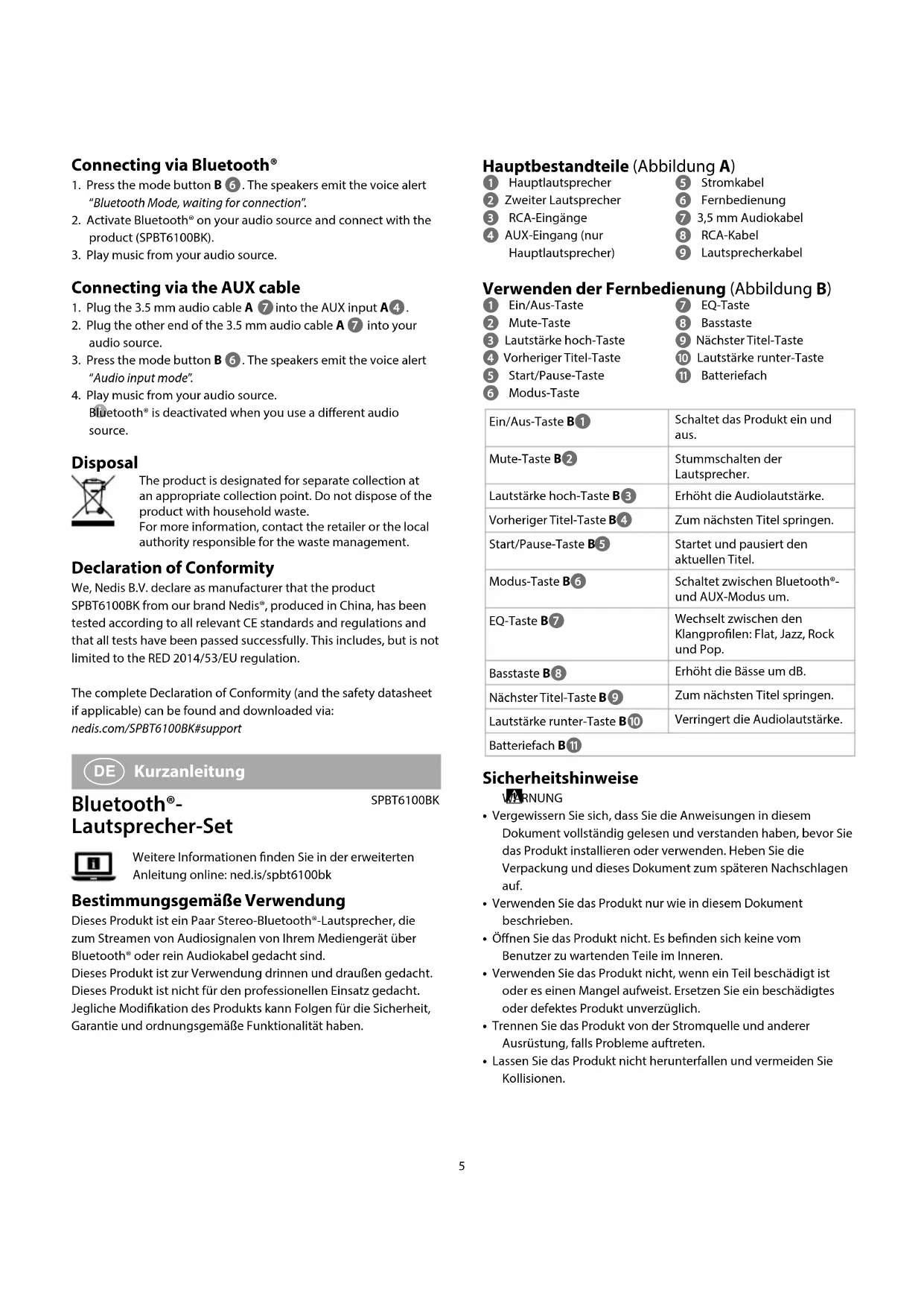 Ihre Audioquelle.3. Drücken Sie die Modus-Taste B . Aus den Lautsprechern ertönt die Sprachwarnung „Audio input mode“.4. Geben Sie Musik auf Ihrem Audiogerät wieder. Bluetooth® ist deaktiviert, wenn Sie eine andere Audioquelle verwenden. Entsorgung Dieses Produkt muss an einer entsprechenden Sammelstelle zur Entsorgung abgegeben werden. Entsorgen Sie das Produkt nicht mit dem Haushaltsabfall.Weitere Informationen erhalten Sie beim Verkäufer oder der für die Abfallwirtschaft verantwortlichen örtlichen Behörde. Konformitätserklärung Wir, Nedis B.V., erklären als Hersteller, dass das Produkt SPBT6100BK unserer Marke Nedis®, produziert in China, nach allen geltenden CE-Standards und Vorschriften getestet wurde und alle diese Tests erfolgreich bestanden hat. Dies gilt unter anderem auch für die Richtlinie RED 2014/53/EU.Die vollständige Konformitätserklärung (und das Sicherheitsdatenblatt, falls zutreend) steht zum Download zur Verfügung unter:nedis.de/SPBT6100BK#support