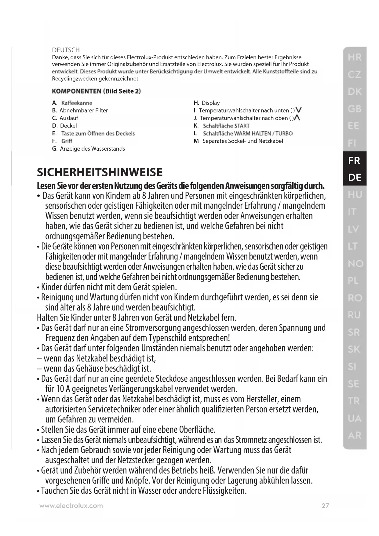 Ihre Pflichten als Endnutzer Dieses Elektro- bzw. Elektronikgerät ist mit einer durchgestrichenen Abfalltonne auf Rädern gekennzeichnet. Das Gerät darf deshalb nur getrennt vom unsortierten Siedlungsabfall gesammelt und zurückgenommen werden, es darf also nicht in den Hausmüll gegeben werden. Das Gerät kann z. B. bei einer kommunalen Sammelstelle oder ggf. bei einem Vertreiber (siehe zu deren Rücknahmepflichten unten) abgegeben werden. Das gilt auch für alle Bauteile, Unterbaugruppen und Verbrauchsmaterial- ien des zu entsorgenden Altgeräts. Gilt nur, wenn das Produkt Batterien und/oder entnehmbare Leuchtmittel enthält.Bevor das Altgerät entsorgt werden darf, müssen alle Altbatterien und Altakkumulatoren vom Altgerät getrenntwerden, die nicht vom Altgerät umschlossensind. Das gleiche gilt für Lampen, die zerstörungsfrei aus dem Altgerät entnommen werden können. Der Endnutzer ist zudem selbst dafür verantwortlich, personenbezogene Daten auf dem Altgerätzu löschen. Rücknahmepflichten von Vertreibern und andere Möglichkeiten der Entsorgung von Elektro- und Elektronikgeräten in der Region Wallonien Hinweise zum Recycling Helfen Sie mit, alle Materialien zu recyceln, die mit diesem Symbol gekennzeichnet sind. Entsorgen Sie solche Materialien, insbesondere Verpackungen, nicht im Hausmüll sondern über die bereitgestellten Recyclingbehälter oder die entsprechenden örtlichen Sammelsysteme.Recyceln Sie zum Umwelt- und Gesundheitsschutz auch elektrische und elektronische Geräte. Rücknahmepflichten der Vertreiber in Deutschland Wer auf mindestens 400 m² Verkaufsfläche Elektro- und Elektronikgeräte vertreibt oder sonst geschäftlich an Endnutzer abgibt, ist verpflichtet, bei Abgabe eines neuen Geräts ein Altgerät des Endnutzers der gleichen Geräteart, das im Wesentlichen die gleichen Funktionen wie das neue Gerät erfüllt, am Ort der Abgabe oder in unmittelbarer Nähe hierzu unentgeltlich zurückzunehmen. Das gilt auch für Vertreiber von Lebensmit- teln mit einer Gesamtverkaufsfläche von mindestens 800 m², die mehrmals im Kalenderjahr oder dauerhaft Elektro- und Elektronikgeräte anbieten und auf dem Markt bereitstellen. Solche Vertreiber müssen zudem auf Verlangen des Endnutzers Altgeräte, die in keiner äußeren Abmessung größer als 25 cm sind (kleine Elektrogeräte), im Einzelhandelsgeschäft oder in unmittelbarer Nähe hierzu unentgeltlich zurückzunehmen; die Rücknahme darf in diesem Fall nicht an den Kauf eines Elektro- oder Elektronikgerätes geknüpft, kann aber auf drei Altgeräte pro Geräteart beschränkt werden. Ort der Abgabe ist auch der private Haushalt, wenn das neue Elektro- oder Elektronikgerät dorthin geliefert wird; in diesem Fall ist die Abholung des Altgerätes für den Endnutzer kostenlos.Die vorstehenden Pflichten gelten auch für den Vertrieb unter Verwendung von Fernkommunikationsmitteln, wenn die Vertreiber Lager- und Versandflächen für Elektro- und Elektronikgeräte bzw. Gesamtlager- und -versandflächen für Lebensmittel vorhalten, die den oben genannten Verkaufsflächen entsprechen. Die unentgeltliche Abholung von Elektro- und Elektronikgeräten ist dann aber auf Wärmeüberträger (z. B. Kühlschrank), Bildschirme, Monitore und Geräte, die Bildschirme mit einer Oberfläche von mehr als 100 cm² enthalten, und Geräte beschränkt, bei denen mindestens eine der äußeren Abmessungen mehr als 50 cm beträgt. Für alle übrigen Elektro- und Elektronikgeräte muss der Vertreiber geeignete Rückgabemögli- chkeiten in zumutbarer Entfernung zum jeweiligen Endnutzer gewährleisten; das gilt auch für kleine Elektrogeräte (s.o.), die der Endnutzer zurückgeben will, ohne ein neues Gerät zu kaufen. Vertreiber, die Elektro- und Elektronikgeräte verkaufen, sind verpflichtet, bei der Lieferung von Neugeräten Altgeräte desselben Typs, die im Wesentlichen die gleichen Funktionen wie die Neugeräte erfüllen, kostenlos vom Endverbraucher zurückzunehmen. Dies gilt auch bei der Lieferung von neuen Elektround Elektronikgeräten oder beim Fernabsatz. Darüber hinaus ist jeder, der Elektro- und Elektronikgeräte auf einer Verkaufsfläche von mindestens 400 m² verkauft, verpflichtet, Altgeräte, die in keiner äußeren Abmessung größer als 25 cm sind (Elektrokleingeräte), im Ladengeschäft oder in unmittelbarer Nähe kostenlos zurückzunehmen; die Rücknahme darf in diesem Fall nicht vom Kauf eines Elektro- oder Elektronikgerätes abhängig gemacht werden. Die Rücknahme von Elektro- und Elektronikgeräten kann auch auf Containerplätzen oder zugelassenen Recyclinghöfen erfolgen. Für weitere Informationen wenden Sie sich bitte an Ihre Gemeindeverwaltung.31www.electrolux.com MAGYAR Köszönjük, hogy ezt az Electrolux terméket választotta. Kérjük, hogy mindig eredeti Electrolux tartozékokat és alkatrészeket használjon, hogy készülékével a legjobb eredményt érje el. Ezek kifejezetten az Ön termékéhez lettek tervezve. Ezt a terméket a környezetvédelem szem előtt tartásával terveztük. Minden műanyag alkatrész újrahasznosítás céljából jelöléssel van ellátva. kép a 2. oldalon A. Kancsó B. Kivehető hálós szűrő C. Kiöntőcsőr D. Fedél E. Fedél nyitógomb F. Fogantyú G. Vízszintjelző H. Kijelző