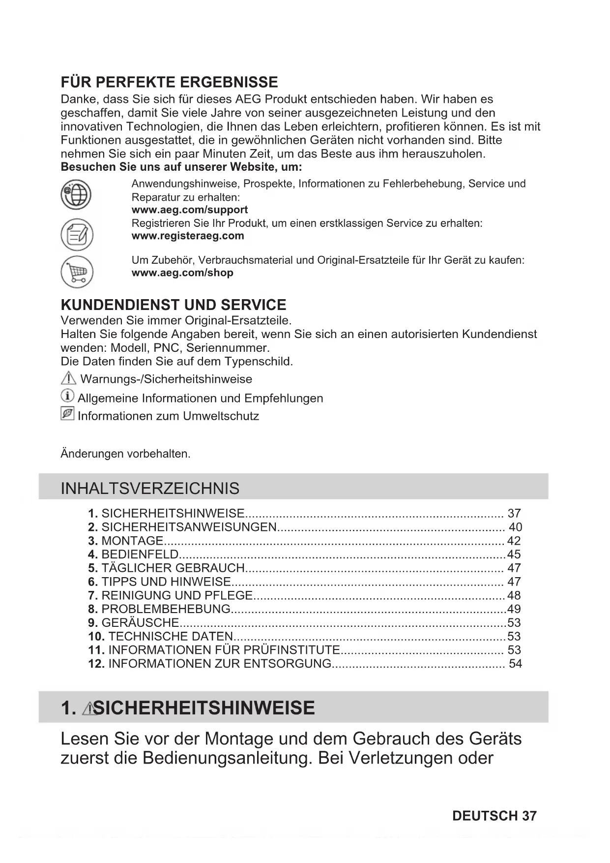 Danke, dass Sie sich für dieses AEG Produkt entschieden haben. Wir haben esgeschaffen, damit Sie viele Jahre von seiner ausgezeichneten Leistung und deninnovativen Technologien, die Ihnen das Leben erleichtern, profitieren können. Es ist mitFunktionen ausgestattet, die in gewöhnlichen Geräten nicht vorhanden sind. Bittenehmen Sie sich ein paar Minuten Zeit, um das Beste aus ihm herauszuholen.Besuchen Sie uns auf unserer Website, um:Anwendungshinweise, Prospekte, Informationen zu Fehlerbehebung, Service undReparatur zu erhalten:www.aeg.com/supportRegistrieren Sie Ihr Produkt, um einen erstklassigen Service zu erhalten:www.registeraeg.comUm Zubehör, Verbrauchsmaterial und Original-Ersatzteile für Ihr Gerät zu kaufen:www.aeg.com/shop