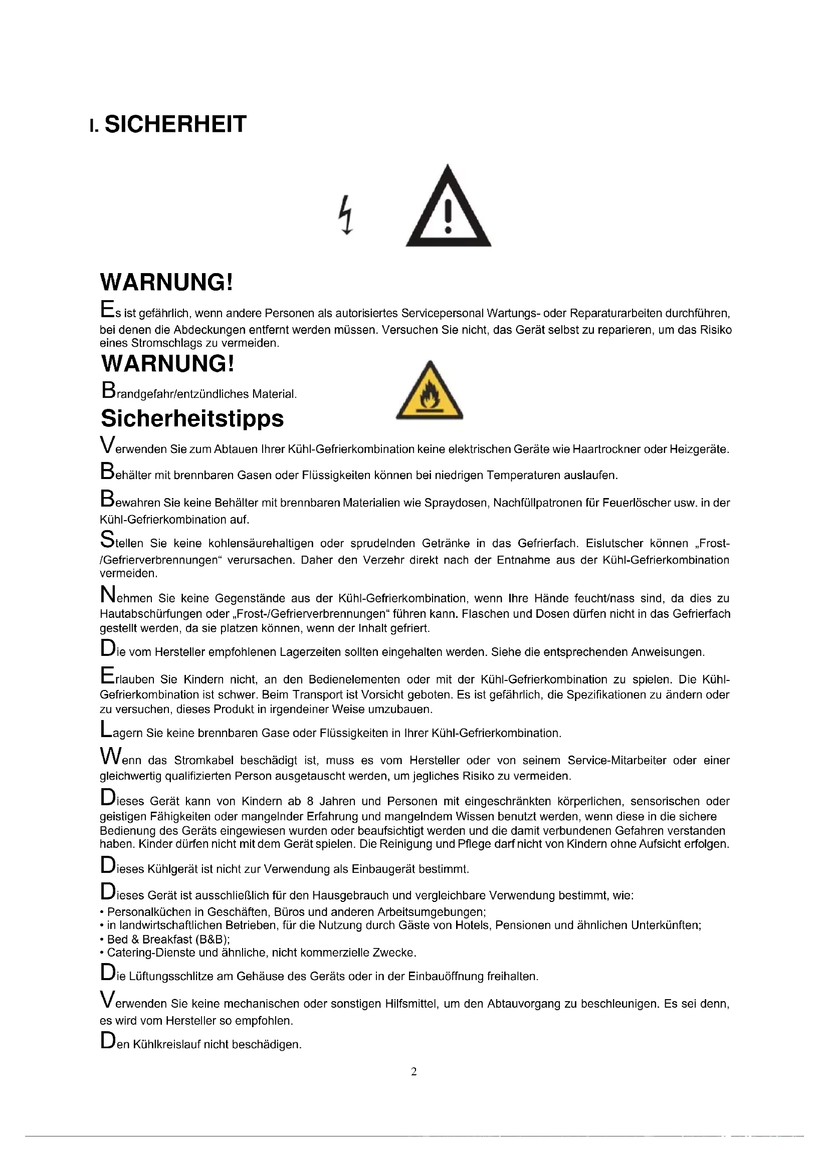 WARNUNG! Es ist gefährlich, wenn andere Personen als autorisiertes Servicepersonal Wartungs- oder Reparaturarbeiten durchführen, bei denen die Abdeckungen entfernt werden müssen. Versuchen Sie nicht, das Gerät selbst zu reparieren, um das Risiko eines Stromschlags zu vermeiden. WARNUNG! Brandgefahr/entzündliches Material. Sicherheitstipps Verwenden Sie zum Abtauen Ihrer Kühl-Gefrierkombination keine elektrischen Geräte wie Haartrockner oder Heizgeräte. Behälter mit brennbaren Gasen oder Flüssigkeiten können bei niedrigen Temperaturen auslaufen. Bewahren Sie keine Behälter mit brennbaren Materialien wie Spraydosen, Nachfüllpatronen für Feuerlöscher usw. in der Kühl-Gefrierkombination auf. Stellen Sie keine kohlensäurehaltigen oder sprudelnden Getränke in das Gefrierfach. Eislutscher können „Frost- /Gefrierverbrennungen“ verursachen. Daher den Verzehr direkt nach der Entnahme aus der Kühl-Gefrierkombination vermeiden. Nehmen Sie keine Gegenstände aus der Kühl-Gefrierkombination, wenn Ihre Hände feucht/nass sind, da dies zu Hautabschürfungen oder „Frost-/Gefrierverbrennungen“ führen kann. Flaschen und Dosen dürfen nicht in das Gefrierfach gestellt werden, da sie platzen können, wenn der Inhalt gefriert. Die vom Hersteller empfohlenen Lagerzeiten sollten eingehalten werden. Siehe die entsprechenden Anweisungen. Erlauben Sie Kindern nicht, an den Bedienelementen oder mit der Kühl-Gefrierkombination zu spielen. Die Kühl- Gefrierkombination ist schwer. Beim Transport ist Vorsicht geboten. Es ist gefährlich, die Spezifikationen zu ändern oder zu versuchen, dieses Produkt in irgendeiner Weise umzubauen. Lagern Sie keine brennbaren Gase oder Flüssigkeiten in Ihrer Kühl-Gefrierkombination. Wenn das Stromkabel beschädigt ist, muss es vom Hersteller oder von seinem Service-Mitarbeiter oder einer gleichwertig qualifizierten Person ausgetauscht werden, um jegliches Risiko zu vermeiden. Dieses Gerät kann von Kindern ab 8 Jahren und Personen mit eingeschränkten körperlichen, sensorischen oder geistigen Fähigkeiten oder mangelnder Erfahrung und mangelndem Wissen benutzt werden, wenn diese in die sichere Bedienung des Geräts eingewiesen wurden oder beaufsichtigt werden und die damit verbundenen Gefahren verstanden haben. Kinder dürfen nicht mit dem Gerät spielen. Die Reinigung und Pflege darf nicht von Kindern ohne Aufsicht erfolgen. Dieses Kühlgerät ist nicht zur Verwendung als Einbaugerät bestimmt. Dieses Gerät ist ausschließlich für den Hausgebrauch und vergleichbare Verwendung bestimmt, wie: