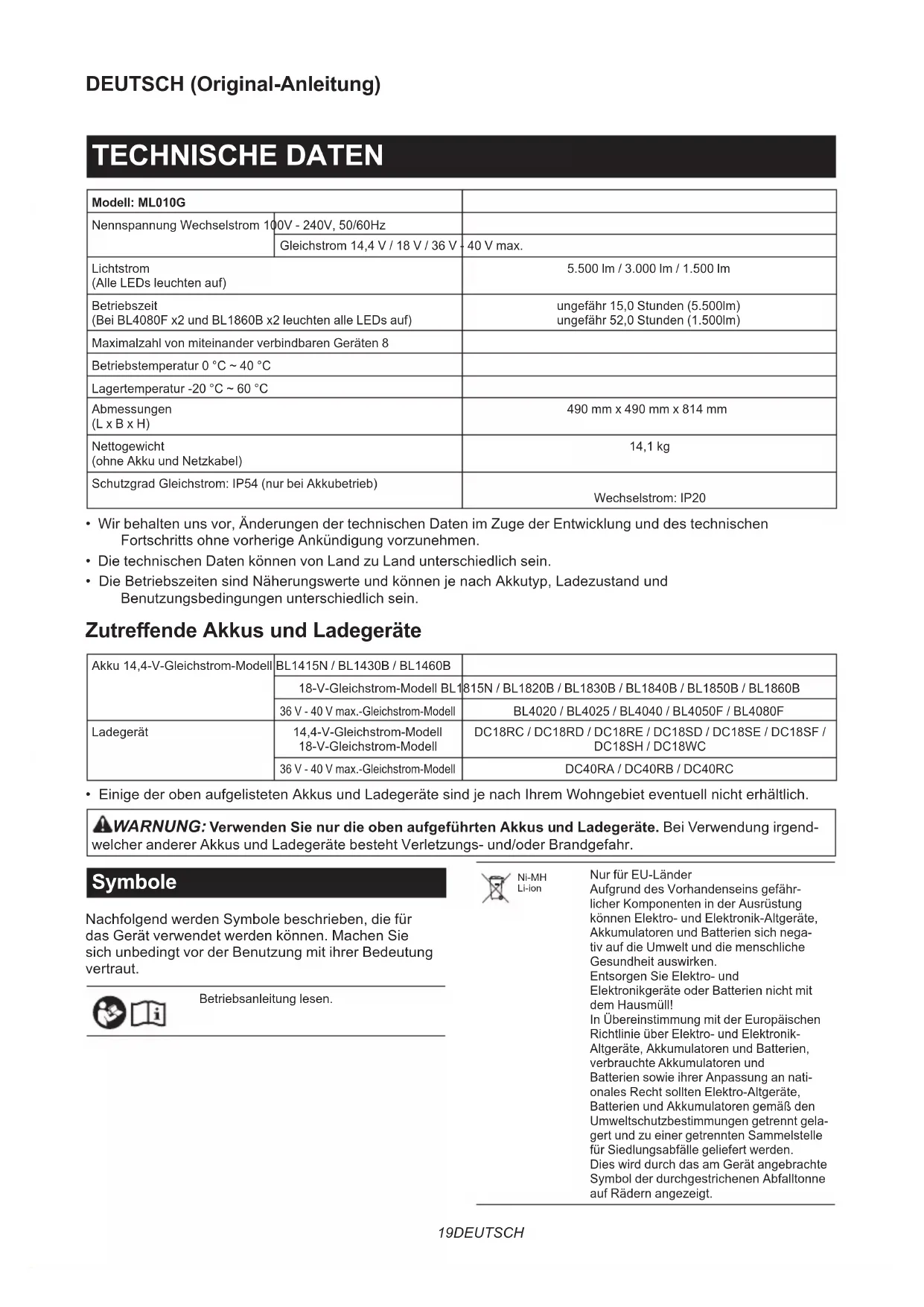 - Einige der oben aufgelisteten Akkus und Ladegeräte sind je nach Ihrem Wohngebiet eventuell nicht erhältlich. WARNUNG: Verwenden Sie nur die oben aufgeführten Akkus und Ladegeräte. Bei Verwendung irgend- welcher anderer Akkus und Ladegeräte besteht Verletzungs- und/oder Brandgefahr. Symbole Nachfolgend werden Symbole beschrieben, die für das Gerät verwendet werden können. Machen Sie sich unbedingt vor der Benutzung mit ihrer Bedeutung vertraut. Betriebsanleitung lesen. Ni-MH Li-ion Nur für EU-Länder Aufgrund des Vorhandenseins gefähr- licher Komponenten in der Ausrüstung können Elektro- und Elektronik-Altgeräte, Akkumulatoren und Batterien sich nega- tiv auf die Umwelt und die menschliche Gesundheit auswirken. Entsorgen Sie Elektro- und Elektronikgeräte oder Batterien nicht mit dem Hausmüll! In Übereinstimmung mit der Europäischen Richtlinie über Elektro- und Elektronik- Altgeräte, Akkumulatoren und Batterien, verbrauchte Akkumulatoren und Batterien sowie ihrer Anpassung an nati- onales Recht sollten Elektro-Altgeräte, Batterien und Akkumulatoren gemäß den Umweltschutzbestimmungen getrennt gela- gert und zu einer getrennten Sammelstelle für Siedlungsabfälle geliefert werden. Dies wird durch das am Gerät angebrachte Symbol der durchgestrichenen Abfalltonne auf Rädern angezeigt.20 DEUTSCH Besondere Umsicht und Aufmerksamkeit erforderlich.Optische Strahlung (UV und IR).Reduzieren Sie die Bestrahlung von Augen oder Haut auf ein Minimum.Starren Sie nicht auf die leuchtende Lampe.Verwenden Sie angemessene Abschirmung oder Augenschutz.Benutzen Sie das Gerät nicht bei Regen, Schnee, Feuchtigkeit oder Nässe, wenn Sie es mit Wechselstrom betreiben.Schutzschalter-Neustartknopf Anmerkung Dieses Produkt enthält Lichtquellen der Energieezienzklasse <C> und <D>. Speisung Das Werkzeug darf nur an eine entsprechende Quelle mit der gleichen Spannung angeschlossen werden, wie sie auf dem Typenschild aufgeführt wird, und es kann nur mit Einphasen-Wechselstrom arbei- ten. Bei der Arbeit muss es geerdet sein, damit die Bedienperson keinen Unfall mit elektrischem Strom erleidet. Verwenden Sie ausschließlich Drei-Leiter- Verlängerungsschnuren, welche Dreipol-Stecker mit Erdung haben, und Dreipol-Steckdosen, in welche der Werkzeugstecker eingeführt werden kann. SICHERHEITSWARNUNGEN WICHTIGE SICHERHEITSVORSCHRIFTEN WARNUNG: Lesen Sie alle Sicherheitswarnungen und Anweisungen durch. Eine Missachtung der unten aufgeführten Warnungen und Anweisungen kann zu einem elektrischen Schlag, Brand und/oder schweren Verletzungen führen. LESEN UND