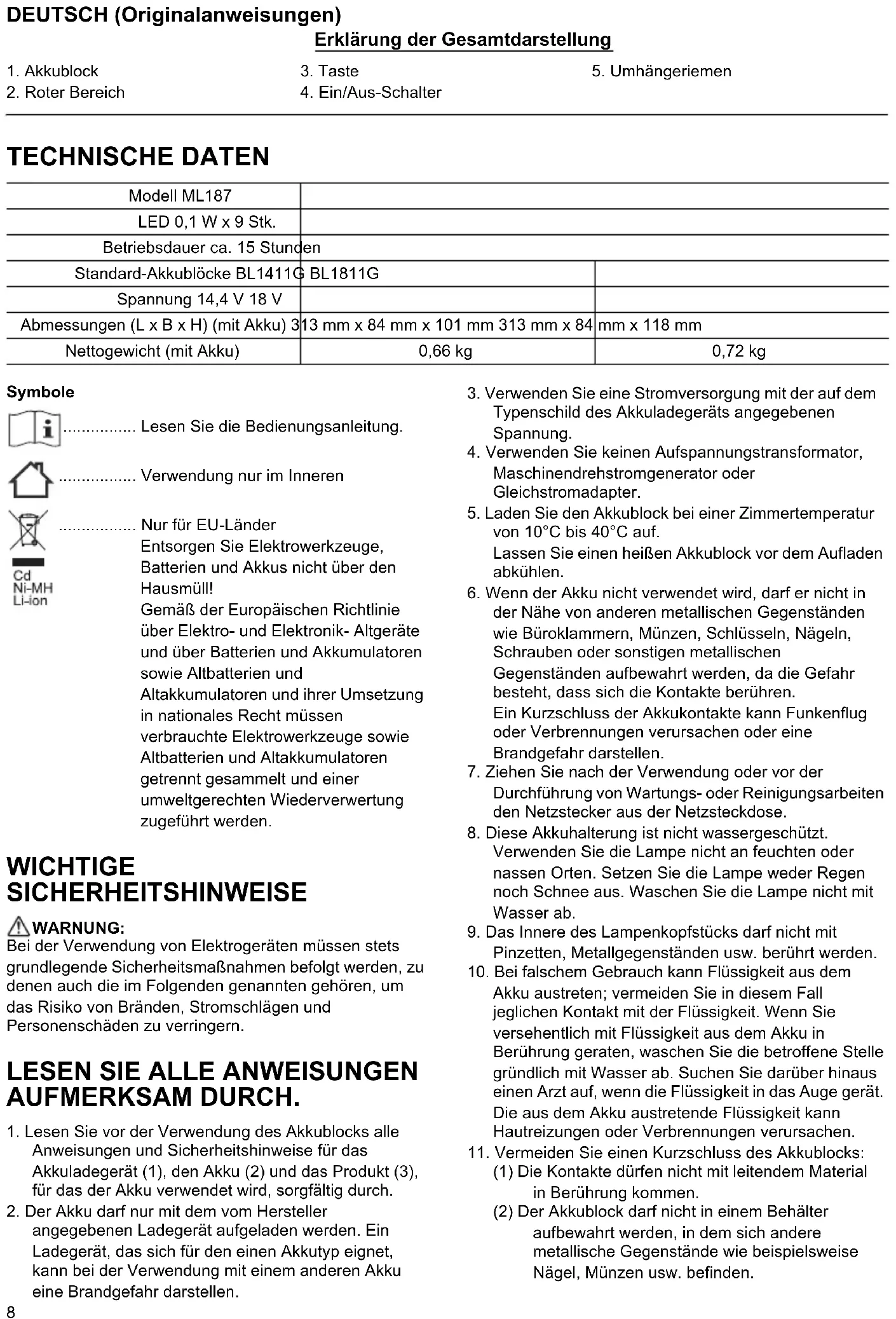 Modell ML187 LED 0,1 W x 9 Stk. Betriebsdauer ca. 15 Stunden Standard-Akkublöcke BL1411G BL1811G Spannung 14,4 V 18 V Abmessungen (L x B x H) (mit Akku) 313 mm x 84 mm x 101 mm 313 mm x 84 mm x 118 mm Nettogewicht (mit Akku) 0,66 kg 0,72 kg9 (3) Der Akkublock darf weder Feuchtigkeit noch Regen ausgesetzt werden. Ein Kurzschluss des Akkus kann zu hohem Kriechstrom, Überhitzung, möglichen Verbrennungen und sogar zu einer Zerstörung des Geräts führen.