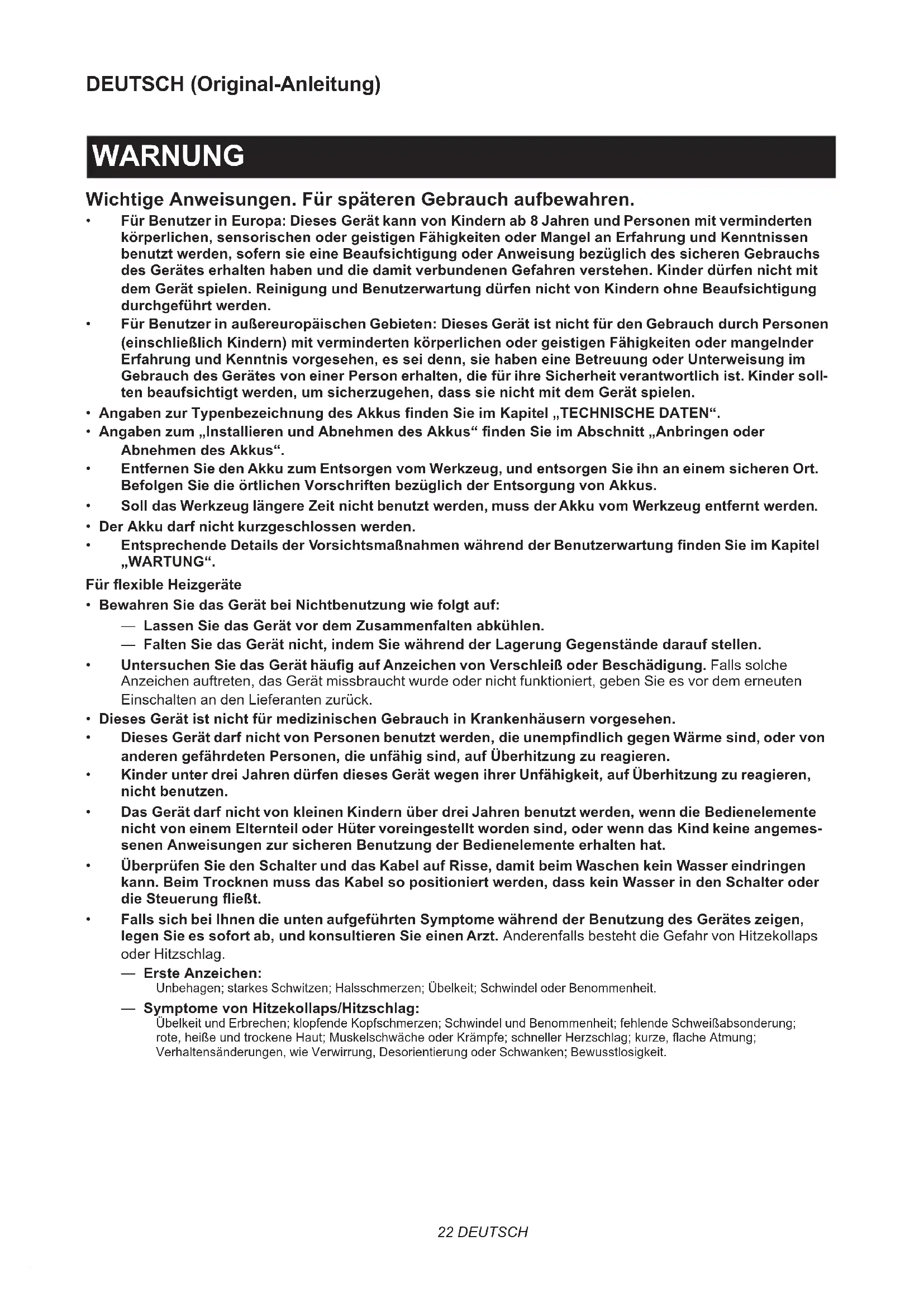 Ni-MHLi-ionNur für EU-LänderAufgrund des Vorhandenseins gefähr-licher Komponenten in der Ausrüstung können Elektro- und Elektronik-Altgeräte, Akkumulatoren und Batterien sich nega-tiv auf die Umwelt und die menschliche Gesundheit auswirken.Entsorgen Sie Elektro- und Elektronikgeräte oder Batterien nicht mit dem Hausmüll!In Übereinstimmung mit der Europäischen Richtlinie über Elektro- und Elektronik-Altgeräte, Akkumulatoren und Batterien, verbrauchte Akkumulatoren und Batterien sowie ihrer Anpassung an nati-onales Recht sollten Elektro-Altgeräte, Batterien und Akkumulatoren gemäß den Umweltschutzbestimmungen getrennt gela-gert und zu einer getrennten Sammelstelle für Siedlungsabfälle geliefert werden.Dies wird durch das am Gerät angebrachte Symbol der durchgestrichenen Abfalltonne auf Rädern angezeigt.Akkus weder Wasser noch Regen aussetzen.Den Akku nicht ins Feuer werfen.Der Akku darf nicht kurzgeschlossen werden. Vorgesehene Verwendung Das Gerät ist zum Aufwärmen des Körpers in kalten Umgebungen vorgesehen. SICHERHEITSWARNUNGEN WARNUNG: Lesen Sie alle Sicherheitswarnungen und Anweisungen durch. Eine Missachtung der unten aufgeführten Warnungen und Anweisungen kann zu einem elektrischen Schlag, Brand und/oder schweren Verletzungen führen. Bewahren Sie alle Warnungen und Anweisungen für spätere Bezugnahme auf. Allgemeine Sicherheitswarnungen