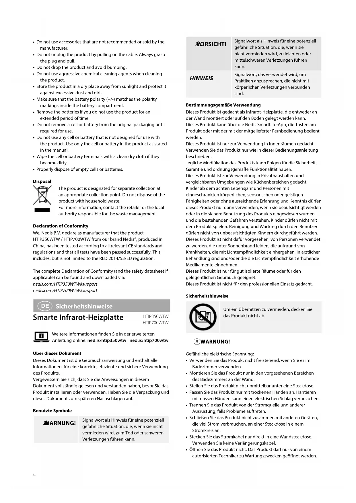 Sicherheitshinweise Smarte Infrarot-Heizplatte HTIP350WTW HTIP700WTWWeitere Informationen nden Sie in der erweiterten Anleitung online: ned.is/htip350wtw | ned.is/htip700wtwÜber dieses DokumentDieses Dokument ist die Gebrauchsanweisung und enthält alle Informationen, für eine korrekte, eziente und sichere Verwendung des Produkts.Vergewissern Sie sich, dass Sie die Anweisungen in diesem Dokument vollständig gelesen und verstanden haben, bevor Sie das Produkt installieren oder verwenden. Heben Sie die Verpackung und dieses Dokument zum späteren Nachschlagen auf.Benutzte Symbole 6 WARNUNG! Signalwort als Hinweis für eine potenziell gefährliche Situation, die, wenn sie nicht vermieden wird, zum Tod oder schweren Verletzungen führen kann. 1 VORSICHT! Signalwort als Hinweis für eine potenziell gefährliche Situation, die, wenn sie nicht vermieden wird, zu leichten oder mittelschweren Verletzungen führen kann. HINWEIS Signalwort, das verwendet wird, um Praktiken anzusprechen, die nicht mit körperlichen Verletzungen verbunden sind.Bestimmungsgemäße VerwendungDieses Produkt ist gedacht als Infrarot-Heizplatte, die entweder an der Wand montiert oder auf den Boden gelegt werden kann.Dieses Produkt kann über die Nedis SmartLife-App, die Tasten am Produkt oder mit der mit der mitgelieferter Fernbedienung bedient werden.Dieses Produkt ist nur zur Verwendung in Innenräumen gedacht.Verwenden Sie das Produkt nur wie in dieser Bedienungsanleitung beschrieben.Jegliche Modikation des Produkts kann Folgen für die Sicherheit, Garantie und ordnungsgemäße Funktionalität haben.Dieses Produkt ist zur Verwendung in Privathaushalten und vergleichbaren Umgebungen wie Küchenbereichen gedacht.Kinder ab dem achten Lebensjahr und Personen mit eingeschränkten körperlichen, sensorischen oder geistigen Fähigkeiten oder ohne ausreichende Erfahrung und Kenntnis dürfen dieses Produkt nur dann verwenden, wenn sie beaufsichtigt werden oder in die sichere Benutzung des Produkts eingewiesen wurden und die bestehenden Gefahren verstehen. Kinder dürfen nicht mit dem Produkt spielen. Reinigung und Wartung durch den Benutzer dürfen nicht von unbeaufsichtigten Kindern durchgeführt werden.Dieses Produkt ist nicht dafür vorgesehen, von Personen verwendet zu werden, die unter Sonnenbrand leiden, die aufgrund von Krankheiten, die mit Lichtempndlichkeit einhergehen, in ärztlicher Behandlung sind und/oder die die Lichtempndlichkeit erhöhende Medikamente einnehmen.Dieses Produkt ist nur für gut isolierte Räume oder für den gelegentlichen Gebrauch geeignet.Dieses Produkt ist nicht für den professionellen Einsatz gedacht.SicherheitshinweiseUm ein Überhitzen zu vermeiden, decken Sie das Produkt nicht ab. 6 WARNUNG! Gefährliche elektrische Spannung:• Verwenden Sie das Produkt nicht freistehend, wenn Sie es im Badezimmer verwenden.• Montieren Sie das Produkt nur in den vorgesehenen Bereichen des Badezimmers an der Wand.• Stellen Sie das Produkt nicht unmittelbar unter eine Steckdose.• Fassen Sie das Produkt nur mit trockenen Händen an. Hantieren mit nassen Händen kann einen elektrischen Schlag verursachen.• Trennen Sie das Produkt von der Stromquelle und anderer Ausrüstung, falls Probleme auftreten.• Schließen Sie das Produkt nicht zusammen mit anderen Geräten, die viel Strom verbrauchen, an einer Steckdose in einem Stromkreis an.• Stecken Sie das Stromkabel nur direkt in eine Wandsteckdose. Verwenden Sie keine Verlängerungskabel.• Önen Sie das Produkt nicht. Das Produkt darf nur von einem autorisierten Techniker zu Wartungszwecken geönet werden.Nedis® SmartLife | Safety instructions 5