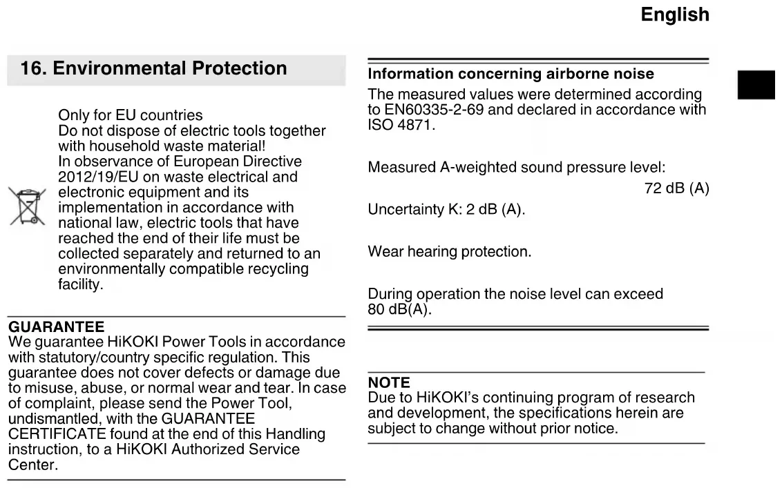*1 am Schlauch, *2 am Gebläse *3 Gewicht: Gemäß EPTA-Verfahren 01/2014 Anschlussleitung bei einem Nass-, Trockensauger mit Steckdose: H05RR-F 3X 1,5 HINWEIS: Aufgrund des ständigen Forschungs- und Entwicklungsprogramms von HiKOKI sind Änderungen der hier gemachten technischen Angaben vorbehalten. Vergleichen Sie vor Inbetriebnahme, ob die auf dem Typenschild angegebene Netzspannung und Netzfrequenz mit den Daten Ihres Stromnetzes übereinstimmen.