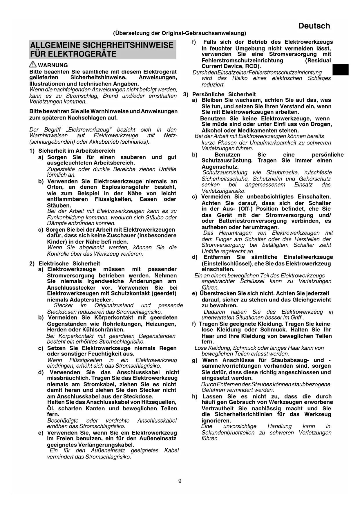 WARNUNG Bitte beachten Sie sämtliche mit diesem Elektrogerät gelieferten Sicherheitshinweise, Anweisungen, Illustrationen und technischen Angaben. Wenn die nachfolgenden Anweisungen nicht befolgt werden, kann es zu Stromschlag, Brand und/oder ernsthaften Verletzungen kommen. Bitte bewahren Sie alle Warnhinweise und Anweisungen zum späteren Nachschlagen auf. Der Begriff „Elektrowerkzeug“ bezieht sich in den Warnhinweisen auf Elektrowerkzeuge mit Netz- (schnurgebunden) oder Akkubetrieb (schnurlos).