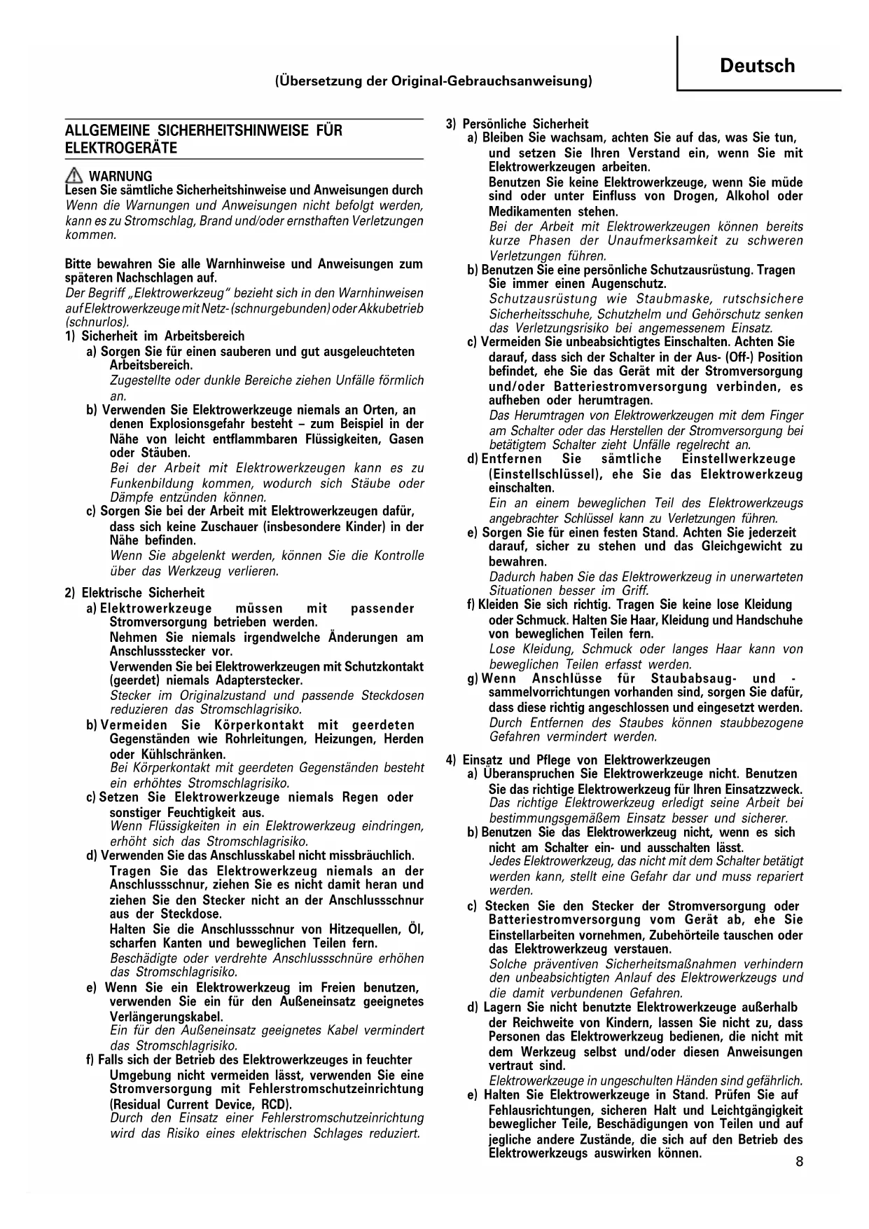 ELEKTROGERÄTE WARNUNG Lesen Sie sämtliche Sicherheitshinweise und Anweisungen durch Wenn die Warnungen und Anweisungen nicht befolgt werden, kann es zu Stromschlag, Brand und/oder ernsthaften Verletzungen kommen. Bitte bewahren Sie alle Warnhinweise und Anweisungen zum späteren Nachschlagen auf. Der Begriff „Elektrowerkzeug“ bezieht sich in den Warnhinweisen auf Elektrowerkzeuge mit Netz- (schnurgebunden) oder Akkubetrieb (schnurlos).
