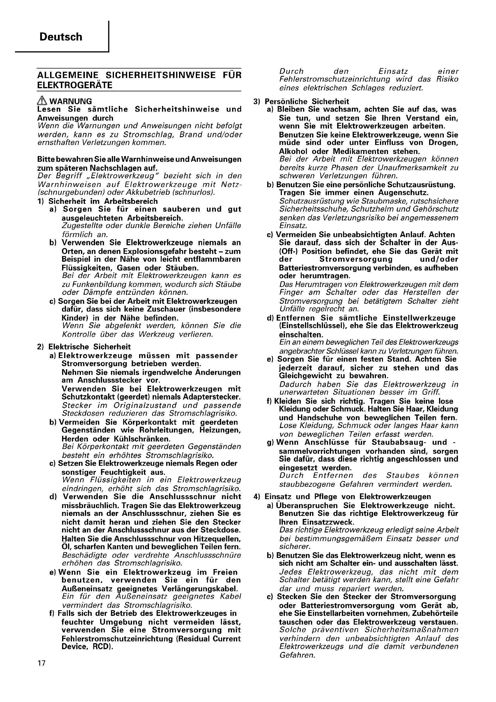a) Überanspruchen Sie Elektrowerkzeuge nicht. Benutzen Sie das richtige Elektrowerkzeug für Ihren Einsatzzweck. Das richtige Elektrowerkzeug erledigt seine Arbeit bei bestimmungsgemäßem Einsatz besser und sicherer. b) Benutzen Sie das Elektrowerkzeug nicht, wenn es sich nicht am Schalter ein- und ausschalten lässt. Jedes Elektrowerkzeug, das nicht mit dem Schalter betätigt werden kann, stellt eine Gefahr dar und muss repariert werden. c) Stecken Sie den Stecker der Stromversorgung oder Batteriestromversorgung vom Gerät ab, ehe Sie Einstellarbeiten vornehmen, Zubehörteile tauschen oder das Elektrowerkzeug verstauen. Solche präventiven Sicherheitsmaßnahmen verhindern den unbeabsichtigten Anlauf des Elektrowerkzeugs und die damit verbundenen Gefahren.Deutsch
