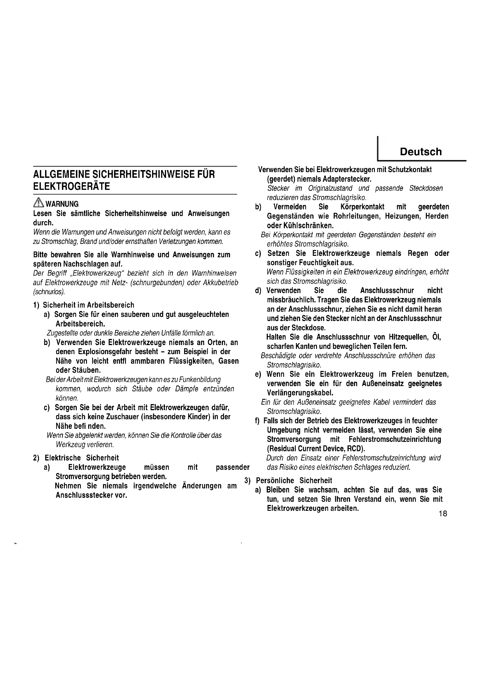 ELEKTROGERÄTE WARNUNG Lesen Sie sämtliche Sicherheitshinweise und Anweisungen durch. Wenn die Warnungen und Anweisungen nicht befolgt werden, kann es zu Stromschlag, Brand und/oder ernsthaften Verletzungen kommen. Bitte bewahren Sie alle Warnhinweise und Anweisungen zum späteren Nachschlagen auf. Der Begriff „Elektrowerkzeug“ bezieht sich in den Warnhinweisen auf Elektrowerkzeuge mit Netz- (schnurgebunden) oder Akkubetrieb (schnurlos).