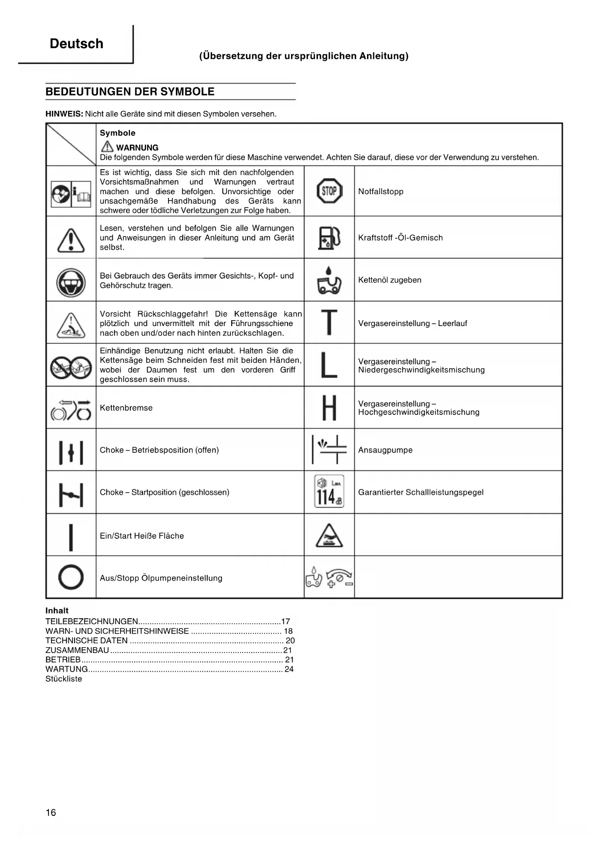 Garantierter Schallleistungspegel Ein/Start Heiße Fläche Aus/Stopp Ölpumpeneinstellung Inhalt TEILEBEZEICHN UNGEN ............................................................... 17