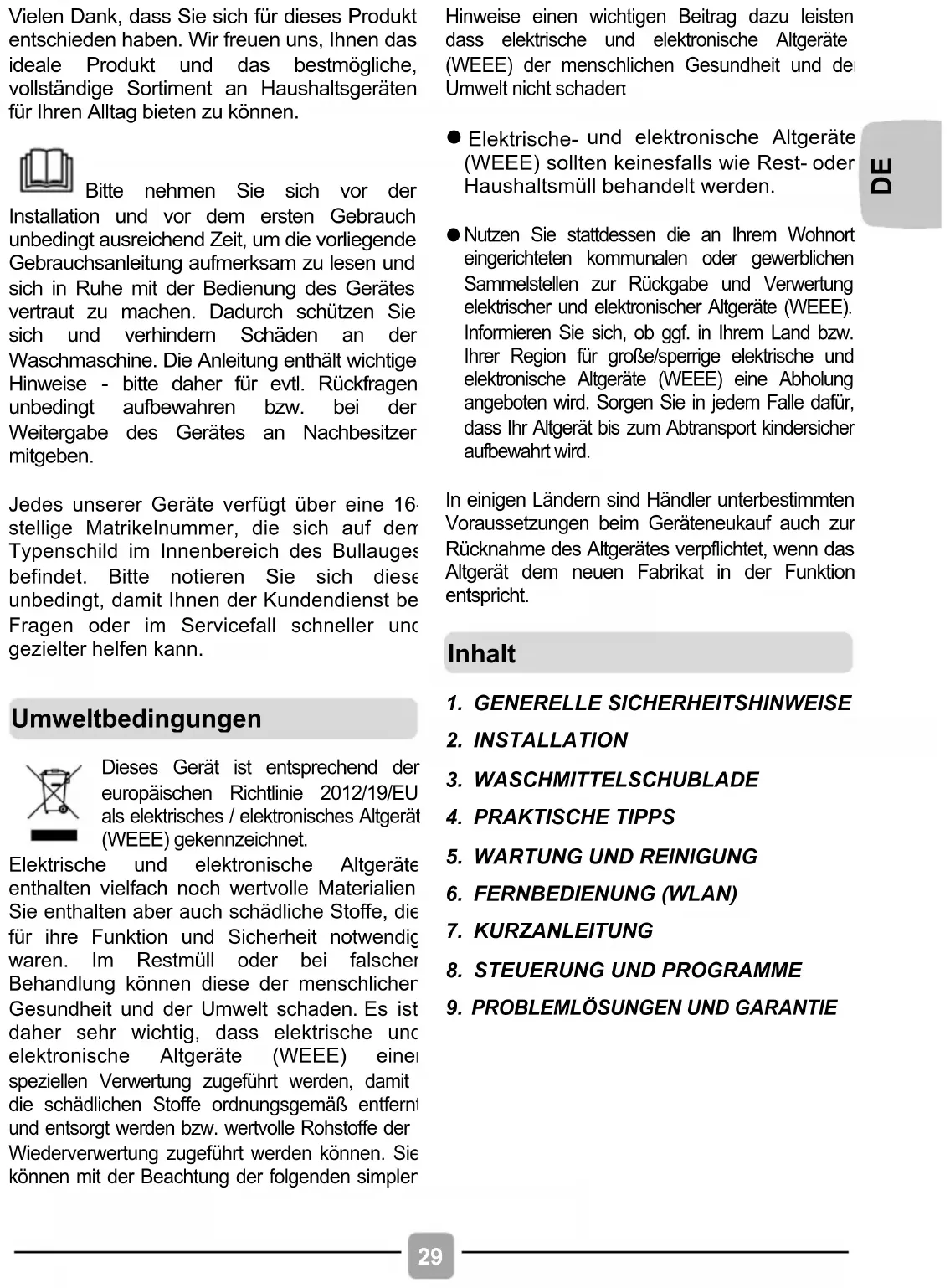 WARNUNG: Wasser kann eine hohe Temperatur während des Waschvorgangs annehmen. Elektrische Anschlüsse und Sicherheitshinweise32