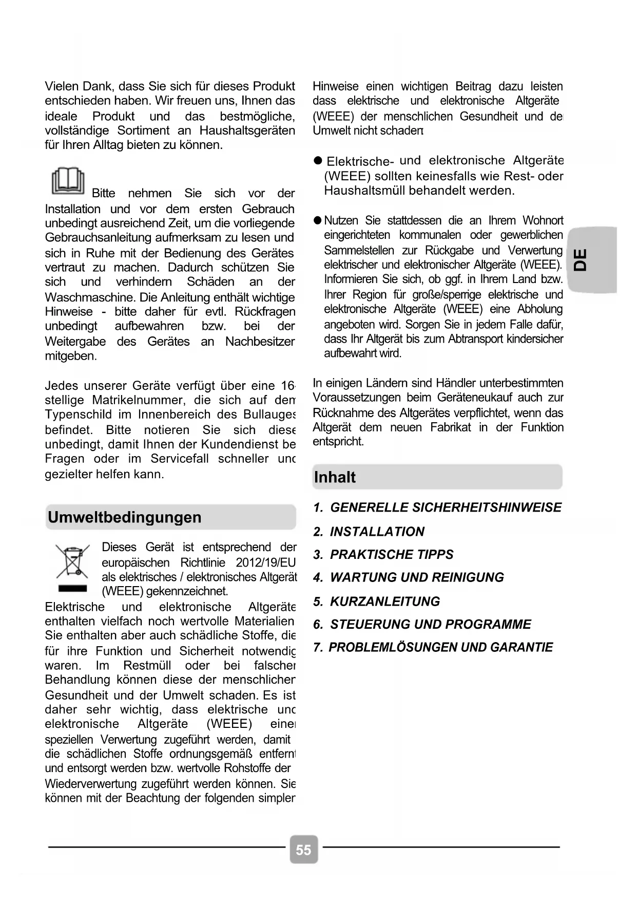 Bitte nehmen Sie sich vor der Installation und vor dem ersten Gebrauch unbedingt ausreichend Zeit, um die vorliegende Gebrauchsanleitung aufmerksam zu lesen und sich in Ruhe mit der Bedienung des Gerätes vertraut zu machen. Dadurch schützen Sie sich und verhindern Schäden an der Waschmaschine. Die Anleitung enthält wichtige Hinweise