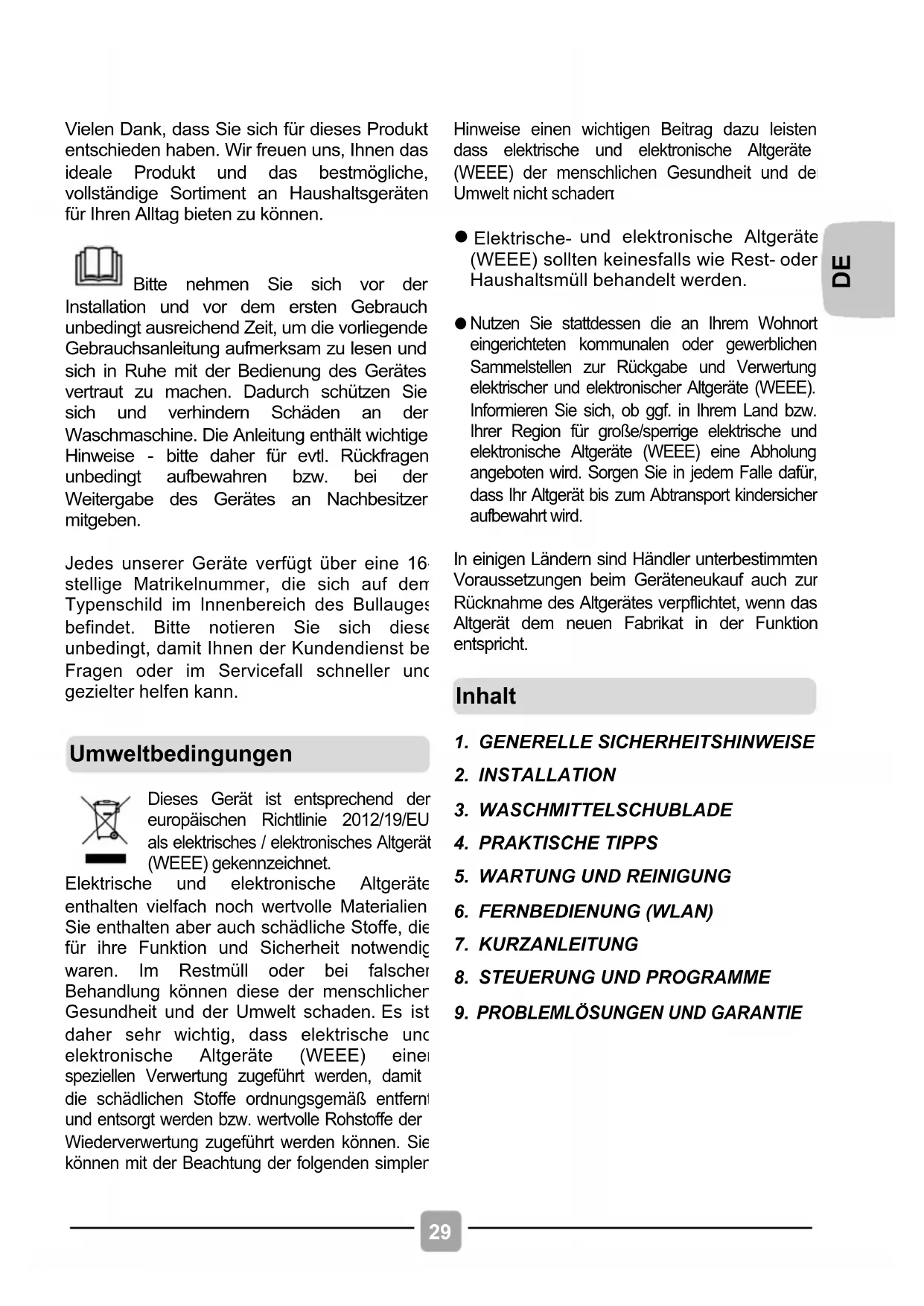 Bitte nehmen Sie sich vor der Installation und vor dem ersten Gebrauch unbedingt ausreichend Zeit, um die vorliegende Gebrauchsanleitung aufmerksam zu lesen und sich in Ruhe mit der Bedienung des Gerätes vertraut zu machen. Dadurch schützen Sie sich und verhindern Schäden an der Waschmaschine. Die Anleitung enthält wichtige Hinweise