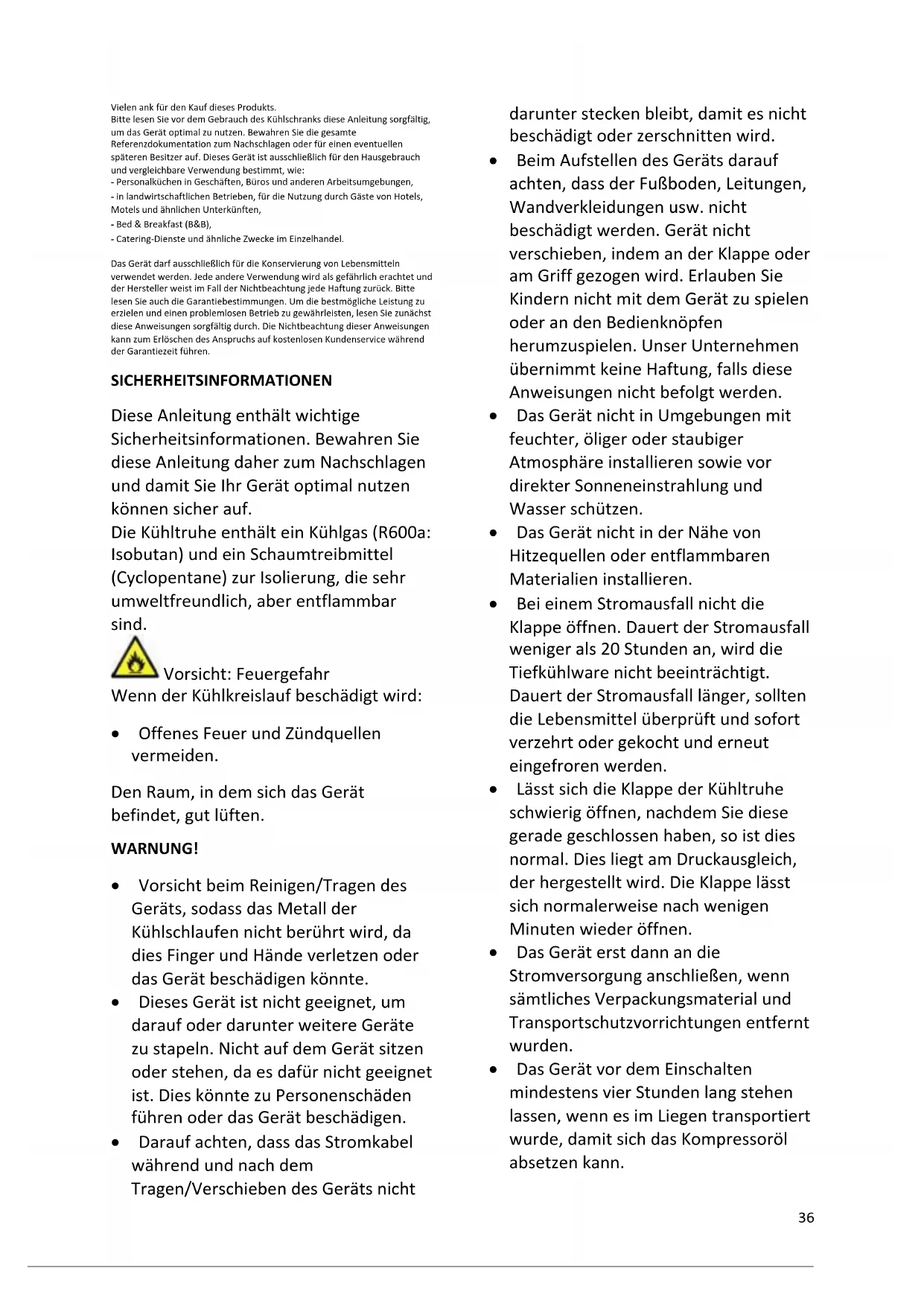 Este electrodoméstico cumple la directiva europea 2012/19/EU en materia de Residuos de Aparatos Eléctricos y Electrónicos (RAEE). Los RAEE contienen tanto sustancias contaminantes (que pueden conllevar consecuencias negativas para el medio ambiente) como componentes básicos (que se pueden reutilizar). Es importante que los RAEE se sometan a tratamientos específicos para eliminar y desechar adecuadamente los contaminantes y recuperar y reciclar todos los materiales. Las personas desempeñan un papel clave a la hora de garantizar que los RAEE no se conviertan en un problema medioambiental. Para ello, es esencial seguir ciertas normas básicas: Los RAEE no deben recibir el mismo tratamiento que los residuos domésticos. Los RAEE deben depositarse en los puntos limpios pertinentes, gestionados por las autoridades locales o por empresas autorizadas. En muchos países, existe un servicio de recogida a domicilio de RAEE de gran tamaño. En muchos países, al comprar un electrodoméstico nuevo, el distribuidor podría encargarse de la recogida del antiguo de forma totalmente gratuita, siempre y cuando el equipo tenga características similares y sea del mismo tipo que el equipo suministrado. Conformidad Mediante la colocación de la marca en este producto confirmamos el cumplimiento de todos los requisitos legislativos europeos relevantes en materia de seguridad, salud y medio ambiente establecidos para este producto.36 Vielen ank für den Kauf dieses Produkts. Bitte lesen Sie vor dem Gebrauch des Kühlschranks diese Anleitung sorgfältig, um das Gerät optimal zu nutzen. Bewahren Sie die gesamte Referenzdokumentation zum Nachschlagen oder für einen eventuellen späteren Besitzer auf. Dieses Gerät ist ausschließlich für den Hausgebrauch und vergleichbare Verwendung bestimmt, wie: - Personalküchen in Geschäften, Büros und anderen Arbeitsumgebungen, - in landwirtschaftlichen Betrieben, für die Nutzung durch Gäste von Hotels, Motels und ähnlichen Unterkünften, - Bed & Breakfast (B&B), - Catering-Dienste und ähnliche Zwecke im Einzelhandel. Das Gerät darf ausschließlich für die Konservierung von Lebensmitteln verwendet werden. Jede andere Verwendung wird als gefährlich erachtet und der Hersteller weist im Fall der Nichtbeachtung jede Haftung zurück. Bitte lesen Sie auch die Garantiebestimmungen. Um die bestmögliche Leistung zu erzielen und einen problemlosen Betrieb zu gewährleisten, lesen Sie zunächst diese Anweisungen sorgfältig durch. Die Nichtbeachtung dieser Anweisungen kann zum Erlöschen des Anspruchs auf kostenlosen Kundenservice während der Garantiezeit führen. SICHERHEITSINFORMATIONEN Diese Anleitung enthält wichtige Sicherheitsinformationen. Bewahren Sie diese Anleitung daher zum Nachschlagen und damit Sie Ihr Gerät optimal nutzen können sicher auf. Die Kühltruhe enthält ein Kühlgas (R600a: Isobutan) und ein Schaumtreibmittel (Cyclopentane) zur Isolierung, die sehr umweltfreundlich, aber entflammbar sind. Vorsicht: Feuergefahr Wenn der Kühlkreislauf beschädigt wird: