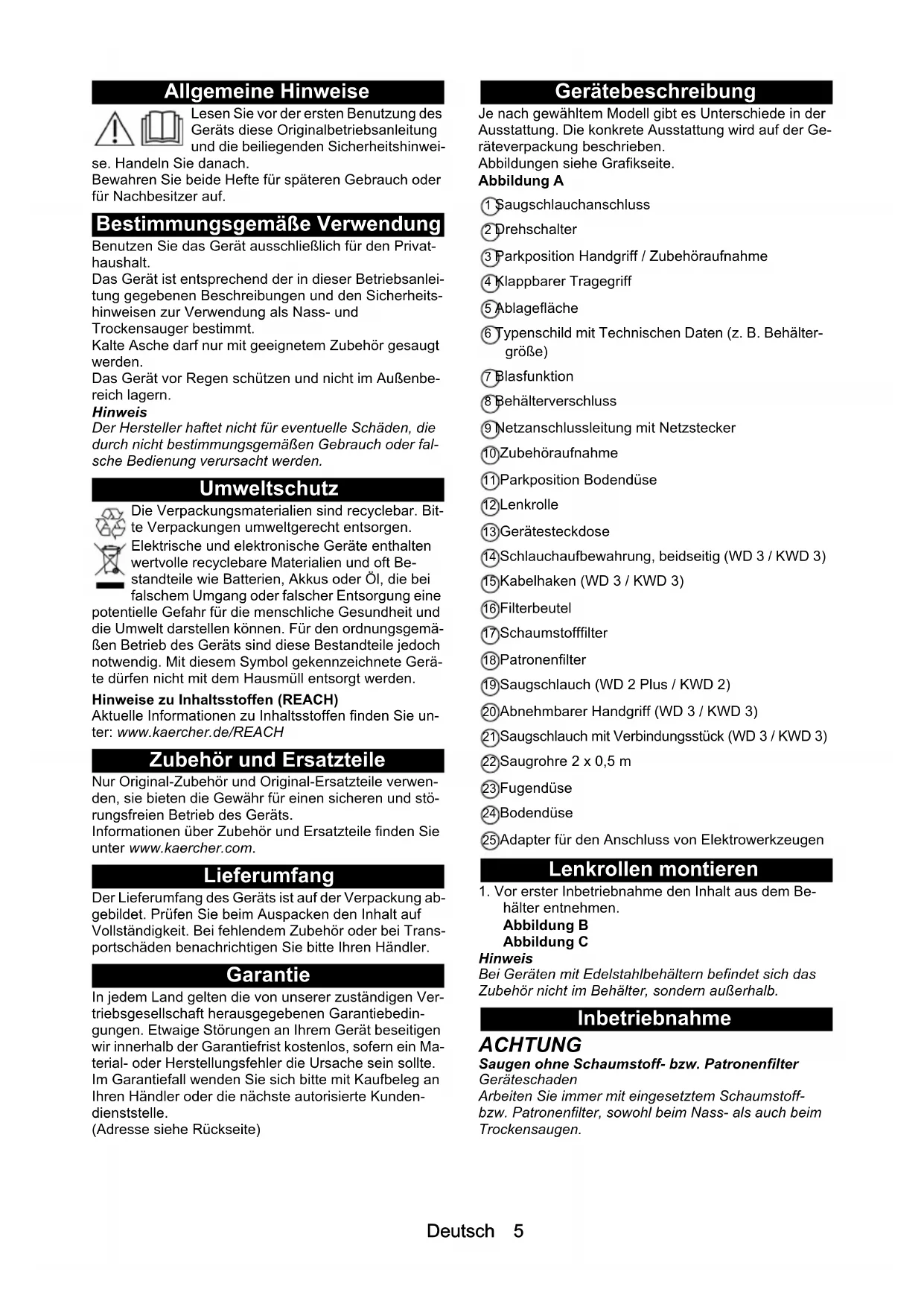 4Deutsch 5 Allgemeine Hinweise Lesen Sie vor der ersten Benutzung des Geräts diese Originalbetriebsanleitung und die beiliegenden Sicherheitshinwei- se. Handeln Sie danach. Bewahren Sie beide Hefte für späteren Gebrauch oder für Nachbesitzer auf. Bestimmungsgemäße Verwendung Benutzen Sie das Gerät ausschließlich für den Privat- haushalt. Das Gerät ist entsprechend der in dieser Betriebsanlei- tung gegebenen Beschreibungen und den Sicherheits- hinweisen zur Verwendung als Nass- und Trockensauger bestimmt. Kalte Asche darf nur mit geeignetem Zubehör gesaugt werden. Das Gerät vor Regen schützen und nicht im Außenbe- reich lagern. Hinweis Der Hersteller haftet nicht für eventuelle Schäden, die durch nicht bestimmungsgemäßen Gebrauch oder fal- sche Bedienung verursacht werden. Umweltschutz Die Verpackungsmaterialien sind recyclebar. Bit- te Verpackungen umweltgerecht entsorgen. Elektrische und elektronische Geräte enthalten wertvolle recyclebare Materialien und oft Be- standteile wie Batterien, Akkus oder Öl, die bei falschem Umgang oder falscher Entsorgung eine potentielle Gefahr für die menschliche Gesundheit und die Umwelt darstellen können. Für den ordnungsgemä- ßen Betrieb des Geräts sind diese Bestandteile jedoch notwendig. Mit diesem Symbol gekennzeichnete Gerä- te dürfen nicht mit dem Hausmüll entsorgt werden. Hinweise zu Inhaltsstoffen (REACH) Aktuelle Informationen zu Inhaltsstoffen finden Sie un- ter: www.kaercher.de/REACH Zubehör und Ersatzteile Nur Original-Zubehör und Original-Ersatzteile verwen- den, sie bieten die Gewähr für einen sicheren und stö- rungsfreien Betrieb des Geräts. Informationen über Zubehör und Ersatzteile finden Sie unter www.kaercher.com. Lieferumfang Der Lieferumfang des Geräts ist auf der Verpackung ab- gebildet. Prüfen Sie beim Auspacken den Inhalt auf Vollständigkeit. Bei fehlendem Zubehör oder bei Trans- portschäden benachrichtigen Sie bitte Ihren Händler. Garantie In jedem Land gelten die von unserer zuständigen Ver- triebsgesellschaft herausgegebenen Garantiebedin- gungen. Etwaige Störungen an Ihrem Gerät beseitigen wir innerhalb der Garantiefrist kostenlos, sofern ein Ma- terial- oder Herstellungsfehler die Ursache sein sollte. Im Garantiefall wenden Sie sich bitte mit Kaufbeleg an Ihren Händler oder die nächste autorisierte Kunden- dienststelle. (Adresse siehe Rückseite) Gerätebeschreibung Je nach gewähltem Modell gibt es Unterschiede in der Ausstattung. Die konkrete Ausstattung wird auf der Ge- räteverpackung beschrieben. Abbildungen siehe Grafikseite. Abbildung A 1 Saugschlauchanschluss 2 Drehschalter 3 Parkposition Handgriff / Zubehöraufnahme 4 Klappbarer Tragegriff 5 Ablagefläche 6 Typenschild mit Technischen Daten (z. B. Behälter- größe) 7 Blasfunktion 8 Behälterverschluss 9 Netzanschlussleitung mit Netzstecker 10 Zubehöraufnahme 11 Parkposition Bodendüse 12 Lenkrolle 13 Gerätesteckdose 14 Schlauchaufbewahrung, beidseitig (WD 3 / KWD 3) 15 Kabelhaken (WD 3 / KWD 3) 16 Filterbeutel 17 Schaumstofffilter 18 Patronenfilter 19 Saugschlauch (WD 2 Plus / KWD 2) 20 Abnehmbarer Handgriff (WD 3 / KWD 3) 21 Saugschlauch mit Verbindungsstück (WD 3 / KWD 3) 22 Saugrohre 2 x 0,5 m 23 Fugendüse 24 Bodendüse 25 Adapter für den Anschluss von Elektrowerkzeugen Lenkrollen montieren