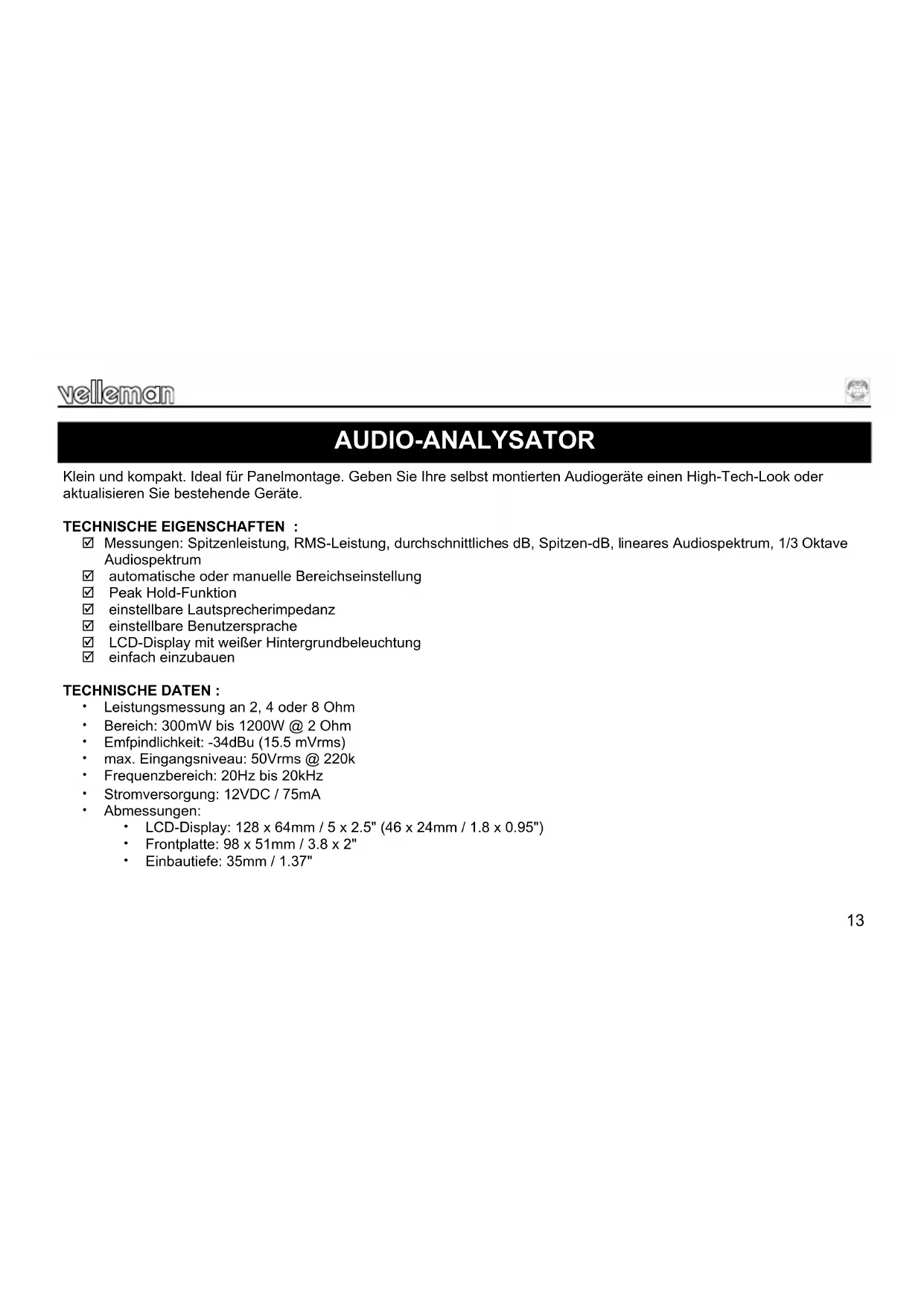 Laden Sie die Anleitung für Ihr Fernseher kostenlos im PDF-Format! Finden Sie Ihr Handbuch K8098 - VELLEMAN und nehmen Sie Ihr elektronisches Gerät wieder in die Hand. Auf dieser Seite sind alle Dokumente veröffentlicht, die für die Verwendung Ihres Geräts notwendig sind. K8098 von der Marke VELLEMAN.