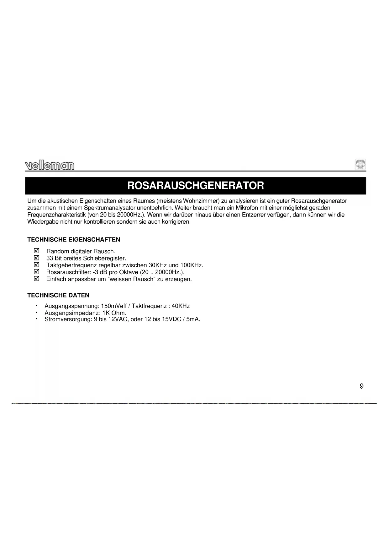 TECHNISCHE EIGENSCHAFTEN Random digitaler Rausch. 33 Bit breites Schieberegister. Taktgeberfrequenz regelbar zwischen 30KHz und 100KHz. Rosarauschfilter: -3 dB pro Oktave (20 .. 20000Hz.). Einfach anpassbar um "weissen Rausch" zu erzeugen.