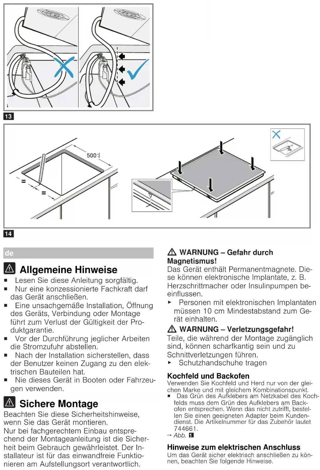 Allgemeine Hinweise ¡ Lesen Sie diese Anleitung sorgfältig. ¡ Nur eine konzessionierte Fachkraft darf das Gerät anschließen. ¡ Eine unsachgemäße Installation, Öffnung des Geräts, Verbindung oder Montage führt zum Verlust der Gültigkeit der Pro- duktgarantie. ¡ Vor der Durchführung jeglicher Arbeiten die Stromzufuhr abstellen. ¡ Nach der Installation sicherstellen, dass der Benutzer keinen Zugang zu den elek- trischen Bauteilen hat. ¡ Nie dieses Gerät in Booten oder Fahrzeu- gen verwenden. Sichere Montage Beachten Sie diese Sicherheitshinweise, wenn Sie das Gerät montieren. Nur bei fachgerechtem Einbau entspre- chend der Montageanleitung ist die Sicher- heit beim Gebrauch gewährleistet. Der In- stallateur ist für das einwandfreie Funktio- nieren am Aufstellungsort verantwortlich. WARNUNG‒Gefahr durch Magnetismus! Das Gerät enthält Permanentmagnete. Die- se können elektronische Implantate, z.B. Herzschrittmacher oder Insulinpumpen be- einflussen. ▶ Personen mit elektronischen Implantaten müssen 10cm Mindestabstand zum Ge- rät einhalten. WARNUNG‒Verletzungsgefahr! Teile, die während der Montage zugänglich sind, können scharfkantig sein und zu Schnittverletzungen führen. ▶ Schutzhandschuhe tragen Kochfeld und Backofen Verwenden Sie Kochfeld und Herd nur von der glei- chen Marke und mit gleichem Kombinationspunkt. ¡ Das Grün des Aufklebers am Netzkabel des Koch- felds muss dem Grün des Aufklebers am Back- ofen entsprechen. Wenn das nicht zutrifft, bestel- len Sie einen geeigneten Adapter beim Kunden- dienst. Die Artikelnummer für das Zubehör lautet
