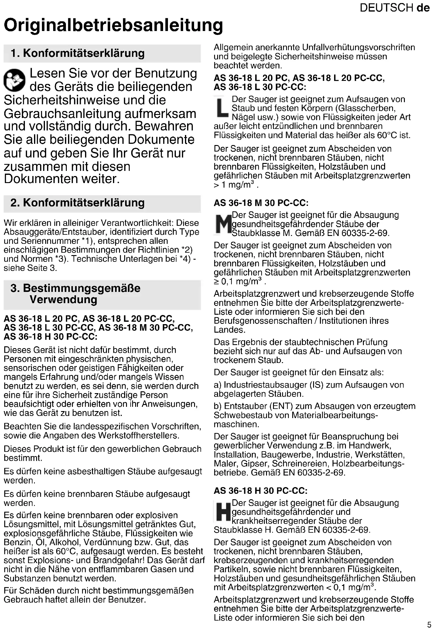 Originalbetriebsanleitung Lesen Sie vor der Benutzung des Geräts die beiliegenden Sicherheitshinweise und die Gebrauchsanleitung aufmerksam und vollständig durch. Bewahren Sie alle beiliegenden Dokumente auf und geben Sie Ihr Gerät nur zusammen mit diesen Dokumenten weiter. Wir erklären in alleiniger Verantwortlichkeit: Diese Absauggeräte/Entstauber, identifiziert durch Type und Seriennummer *1), entsprechen allen einschlägigen Bestimmungen der Richtlinien *2) und Normen *3). Technische Unterlagen bei *4) - siehe Seite 3. AS 36-18 L 20 PC, AS 36-18 L 20 PC-CC, AS 36-18 L 30 PC-CC, AS 36-18 M 30 PC-CC, AS 36-18 H 30 PC-CC: Dieses Gerät ist nicht dafür bestimmt, durch Personen mit eingeschränkten physischen, sensorischen oder geistigen Fähigkeiten oder mangels Erfahrung und/oder mangels Wissen benutzt zu werden, es sei denn, sie werden durch eine für ihre Sicherheit zuständige Person beaufsichtigt oder erhielten von ihr Anweisungen, wie das Gerät zu benutzen ist. Beachten Sie die landesspezifischen Vorschriften, sowie die Angaben des Werkstoffherstellers. Dieses Produkt ist für den gewerblichen Gebrauch bestimmt. Es dürfen keine asbesthaltigen Stäube aufgesaugt werden. Es dürfen keine brennbaren Stäube aufgesaugt werden. Es dürfen keine brennbaren oder explosiven Lösungsmittel, mit Lösungsmittel getränktes Gut, explosionsgefährliche Stäube, Flüssigkeiten wie Benzin, Öl, Alkohol, Verdünnung bzw. Gut, das heißer ist als 60°C, aufgesaugt werden. Es besteht sonst Explosions- und Brandgefahr! Das Gerät darf nicht in die Nähe von entflammbaren Gasen und Substanzen benutzt werden. Für Schäden durch nicht bestimmungsgemäßen Gebrauch haftet allein der Benutzer. Allgemein anerkannte Unfallverhütungsvorschriften und beigelegte Sicherheitshinweise müssen beachtet werden. AS 36-18 L 20 PC, AS 36-18 L 20 PC-CC, AS 36-18 L 30 PC-CC: Der Sauger ist geeignet zum Aufsaugen von Staub und festen Körpern (Glasscherben, Nägel usw.) sowie von Flüssigkeiten jeder Art außer leicht entzündlichen und brennbaren Flüssigkeiten und Material das heißer als 60°C ist. Der Sauger ist geeignet zum Abscheiden von trockenen, nicht brennbaren Stäuben, nicht brennbaren Flüssigkeiten, Holzstäuben und gefährlichen Stäuben mit Arbeitsplatzgrenzwerten > 1 mg/m³ . AS 36-18 M 30 PC-CC: Der Sauger ist geeignet für die Absaugung gesundheitsgefährdender Stäube der Staubklasse M. Gemäß EN 60335-2-69. Der Sauger ist geeignet zum Abscheiden von trockenen, nicht brennbaren Stäuben, nicht brennbaren Flüssigkeiten, Holzstäuben und gefährlichen Stäuben mit Arbeitsplatzgrenzwerten ≥ 0,1 mg/m³ . Arbeitsplatzgrenzwert und krebserzeugende Stoffe entnehmen Sie bitte der Arbeitsplatzgrenzwerte- Liste oder informieren Sie sich bei den Berufsgenossenschaften / Institutionen ihres Landes. Das Ergebnis der staubtechnischen Prüfung bezieht sich nur auf das Ab- und Aufsaugen von trockenem Staub. Der Sauger ist geeignet für den Einsatz als: a) Industriestaubsauger (IS) zum Aufsaugen von abgelagerten Stäuben. b) Entstauber (ENT) zum Absaugen von erzeugtem Schwebestaub von Materialbearbeitungs- maschinen. Der Sauger ist geeignet für Beanspruchung bei gewerblicher Verwendung z.B. im Handwerk, Installation, Baugewerbe, Industrie, Werkstätten, Maler, Gipser, Schreinereien, Holzbearbeitungs- betriebe. Gemäß EN 60335-2-69. AS 36-18 H 30 PC-CC: Der Sauger ist geeignet für die Absaugung gesundheitsgefährdender und krankheitserregender Stäube der Staubklasse H. Gemäß EN 60335-2-69. Der Sauger ist geeignet zum Abscheiden von trockenen, nicht brennbaren Stäuben, krebserzeugenden und krankheitserregenden Partikeln, sowie nicht brennbaren Flüssigkeiten, Holzstäuben und gesundheitsgefährlichen Stäuben mit Arbeitsplatzgrenzwerten < 0,1 mg/m³. Arbeitsplatzgrenzwert und krebserzeugende Stoffe entnehmen Sie bitte der Arbeitsplatzgrenzwerte- Liste oder informieren Sie sich bei den