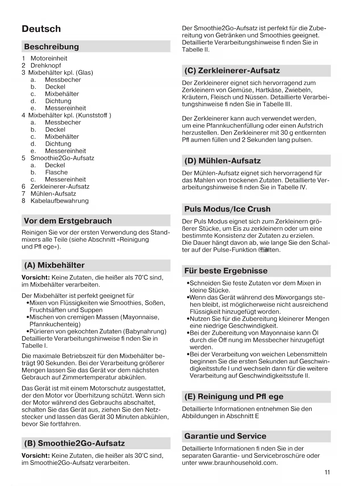 - Bei der Verarbeitung von weichen Lebensmitteln beginnen Sie die ersten Sekunden auf Geschwin- digkeitsstufe I und wechseln dann für die weitere Verarbeitung auf Geschwindigkeitsstufe II. (E) Reinigung und Pfl ege Detaillierte Informationen entnehmen Sie den Abbildungen in Abschnitt E Garantie und Service Detaillierte Informationen fi nden Sie in der separaten Garantie- und Servicebroschüre oder unter www.braunhousehold.com. 5722310505_UI_JB_1xxx_INT.indd 115722310505_UI_JB_1xxx_INT.indd 11 13.01.22 14:1413.01.22 14:1412 Fehlerbehebung Problem Ursache Lösung Das Gerät startet nicht Der Mixbehälter ist nicht korrekt auf der Motoreinheit montiert Überprüfen Sie die korrekte Montage des Mixbehälters. Platzieren Sie den Mixbehälter mit dem Griff auf der rechten oder linken Seite auf die Motoreinheit. Dann drehen Sie den Mixbehälter bis er vollständig verriegelt ist. Der Überhitzungsschutz ist aktiviert Schalten Sie das Gerät aus, ziehen Sie den Netzstecker und warten Sie mindestens 30 Minuten bevor Sie fortfahren. Der Mixbehälter ist undicht Die Dichtung wurde nicht oder nicht korrekt eingesetzt. Überprüfen Sie, ob die Dichtung richtig eingesetzt ist. Die Messereinheit ist nicht richtig fest montiert Montieren Sie die Messereinheit korrekt im Mixbehälter Flüssigkeit spritzt aus dem Mixbehälter Der Mixbehälter wurde zu voll gefüllt Beachten Sie die angegebene maximale Füllmenge Die gewählte Geschwindigkeit ist zu hoch Beachten Sie die angegebenen Geschwindigkeitshinweise English Parts and Accessories 1 Base unit 2 Rotary switch 3 Glass jug a. measuring cap b. lid c. jug d. gasket e. blade group 4 Plastic jug a. measuring cap b. lid c. jug d. gasket e. blade group 5 Smoothie2Go attachment a. lid b. bottle c. blade group 6 Chopper attachment 7 Grinder attachment 8 Cord storage compartment Before First Use Clean all parts before using the blender for the fi rst time – refer to «Care and Cleaning». (A) Jug Caution: Do not blend ingredients hotter than 70°C in the jug. The jug is perfectly suited for