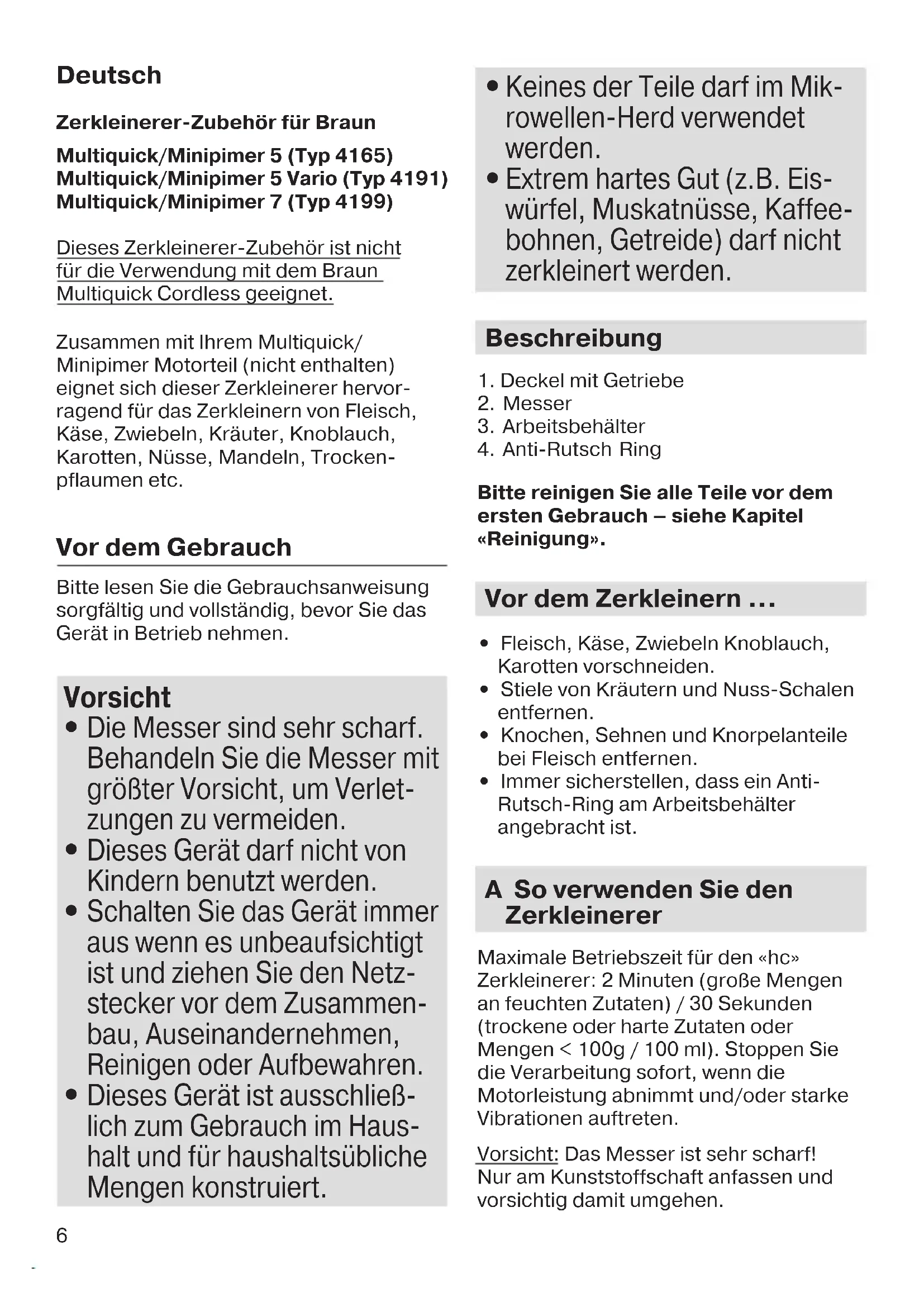 5722112184_MQ20_INT_CN_S5.indd 1 13.04.16 11:546 Deutsch Zerkleinerer-Zubehör für Braun Multiquick/Minipimer 5 (Typ 4165) Multiquick/Minipimer 5 Vario (Typ 4191) Multiquick/Minipimer 7 (Typ 4199) Dieses Zerkleinerer-Zubehör ist nicht für die Verwendung mit dem Braun Multiquick Cordless geeignet. Zusammen mit Ihrem Multiquick/ Minipimer Motorteil (nicht enthalten) eignet sich dieser Zerkleinerer hervor- ragend für das Zerkleinern von Fleisch, Käse, Zwiebeln, Kräuter, Knoblauch, Karotten, Nüsse, Mandeln, Trocken- pflaumen etc. Vor dem Gebrauch Bitte lesen Sie die Gebrauchsanweisung sorgfältig und vollständig, bevor Sie das Gerät in Betrieb nehmen. Vorsicht