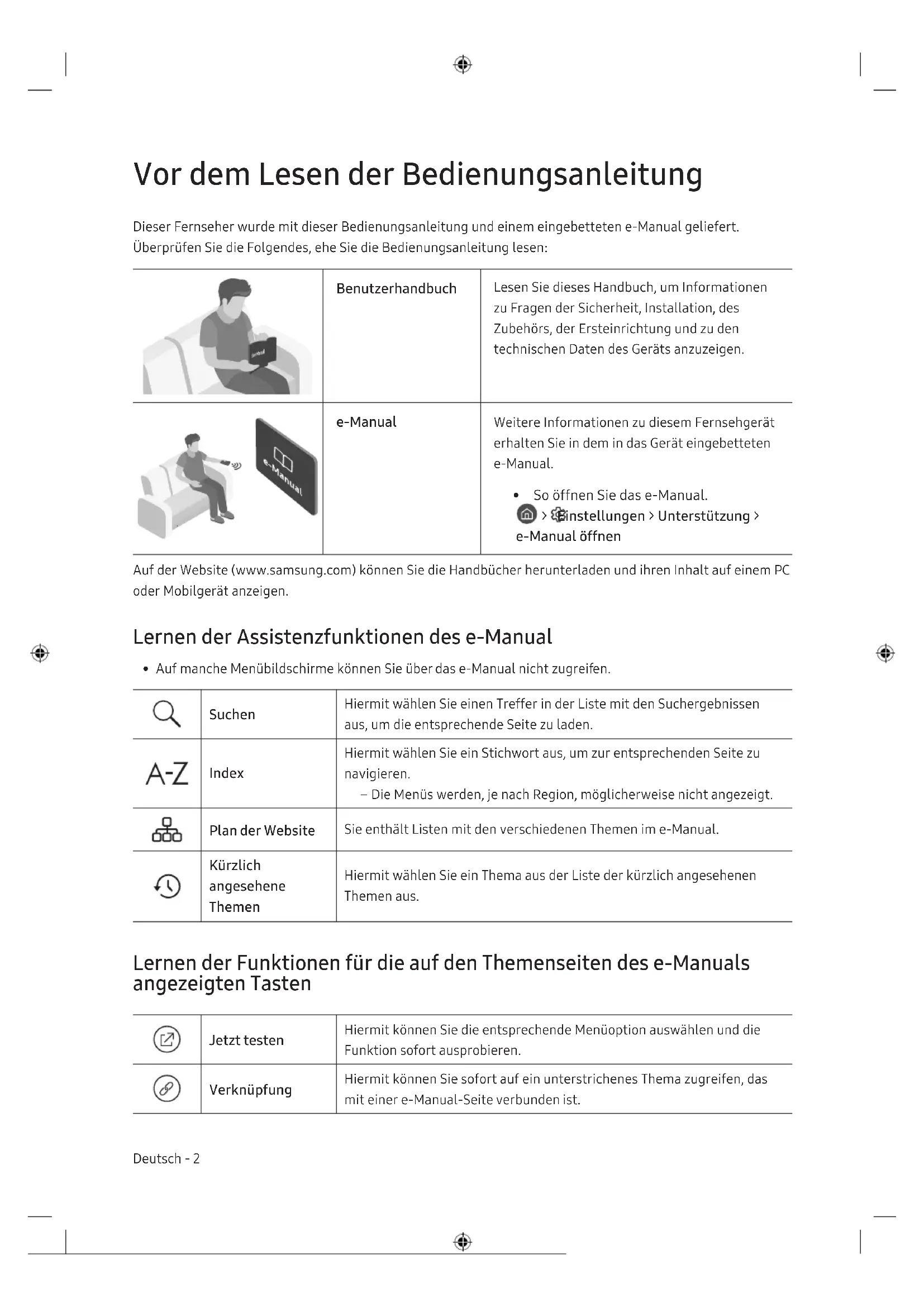 - So öffnen Sie das e-Manual. > Einstellungen > Unterstützung > e-Manual öffnen Auf der Website (www.samsung.com) können Sie die Handbücher herunterladen und ihren Inhalt auf einem PC oder Mobilgerät anzeigen. Lernen der Assistenzfunktionen des e-Manual