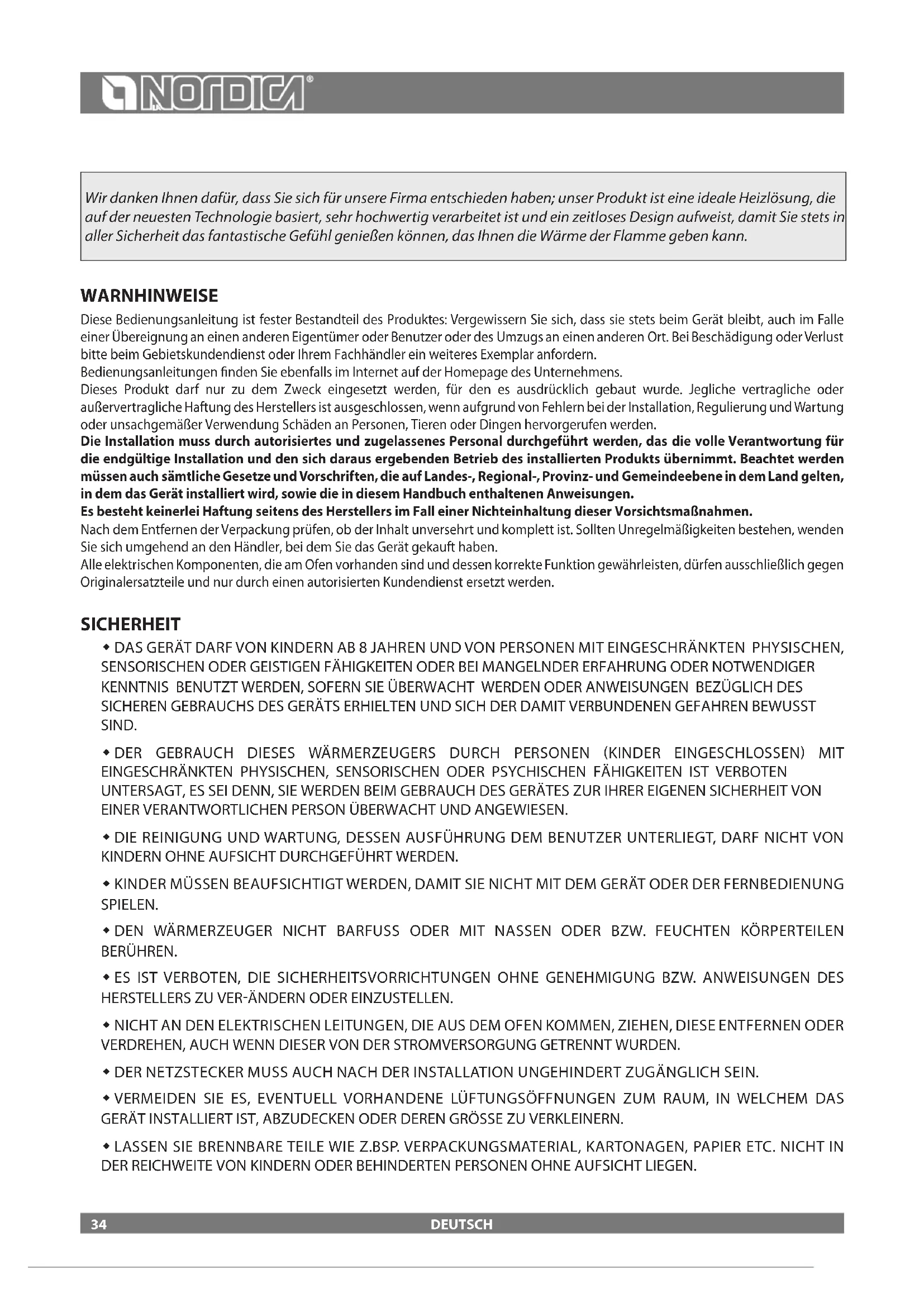 Die regelmäßigen Reinigungsvorgänge müssen gemäß dem vorliegenden Gebrauchs- und Wartungshandbuch sorgfältig ausgeführt werden, nachdem die in diesem angegebenen Anweisungen, Prozeduren und Zeitabstände gelesen wurden. Der Außenlufteinlass mindestens einmal im Jahr prüfen, und ihn reinigen. Der Schornstein muss regelmäßig vom Schornsteinfeger gekehrt werden. Lassen sie von Ihrem gewöhnlichen Schornsteinfeger die ordnungsgemäße Installation des Geräts und die Verbindung mit dem Schornstein und der Belüftung überprüfen. WICHTIG : DIE WARTUNG UND PFLEGE MUSS AUSSCHLIESSLICH BEI KALTER AUSRÜSTUNG AUSGEFÜHRT WERDEN. Es dürfen ausschließlich Ersatzteile benutzt werden, die ausdrücklich von der La NORDICA S.p.A. genehmigt wurden. Falls nötig, wenden Sie sich an einen unserer spezialisierten Händler. AN DEM GERÄT DÜRFEN KEINE VERÄNDERUNGEN VORGENOMMEN WERDEN!