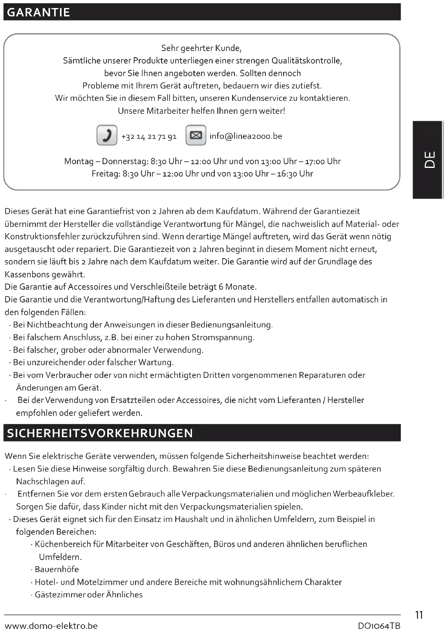 GARANTIE Sehr geehrter Kunde, Sämtliche unserer Produkte unterliegen einer strengen Qualitätskontrolle, bevor Sie Ihnen angeboten werden. Sollten dennoch Probleme mit Ihrem Gerät auftreten, bedauern wir dies zutiefst. Wir möchten Sie in diesem Fall bitten, unseren Kundenservice zu kontaktieren. Unsere Mitarbeiter helfen Ihnen gern weiter! +32 14 21 71 91 info@linea2000.be Montag – Donnerstag: 8:30 Uhr – 12:00 Uhr und von 13:00 Uhr – 17:00 Uhr Freitag: 8:30 Uhr – 12:00 Uhr und von 13:00 Uhr – 16:30 Uhr Dieses Gerät hat eine Garantiefrist von 2 Jahren ab dem Kaufdatum. Während der Garantiezeit übernimmt der Hersteller die vollständige Verantwortung für Mängel, die nachweislich auf Material- oder Konstruktionsfehler zurückzuführen sind. Wenn derartige Mängel auftreten, wird das Gerät wenn nötig ausgetauscht oder repariert. Die Garantiezeit von 2 Jahren beginnt in diesem Moment nicht erneut, sondern sie läuft bis 2 Jahre nach dem Kaufdatum weiter. Die Garantie wird auf der Grundlage des Kassenbons gewährt. Die Garantie auf Accessoires und Verschleißteile beträgt 6 Monate. Die Garantie und die Verantwortung/Haftung des Lieferanten und Herstellers entfallen automatisch in den folgenden Fällen: