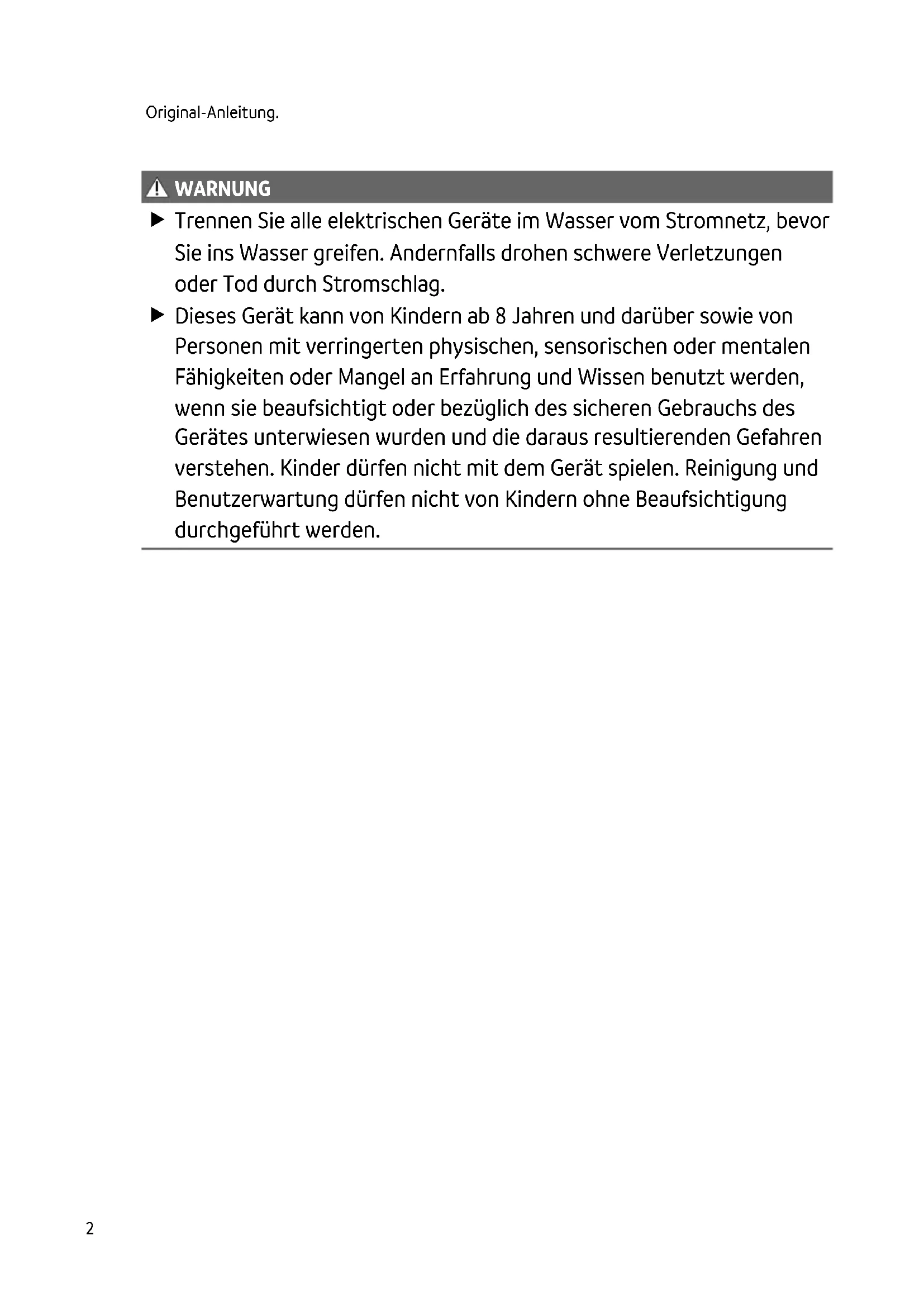 WARNUNG Trennen Sie alle elektrischen Geräte im Wasser vom Stromnetz, bevor Sie ins Wasser greifen. Andernfalls drohen schwere Verletzungen oder Tod durch Stromschlag. Dieses Gerät kann von Kindern ab 8 Jahren und darüber sowie von Personen mit verringerten physischen, sensorischen oder mentalen Fähigkeiten oder Mangel an Erfahrung und Wissen benutzt werden, wenn sie beaufsichtigt oder bezüglich des sicheren Gebrauchs des Gerätes unterwiesen wurden und die daraus resultierenden Gefahren verstehen. Kinder dürfen nicht mit dem Gerät spielen. Reinigung und Benutzerwartung dürfen nicht von Kindern ohne Beaufsichtigung durchgeführt werden.DE