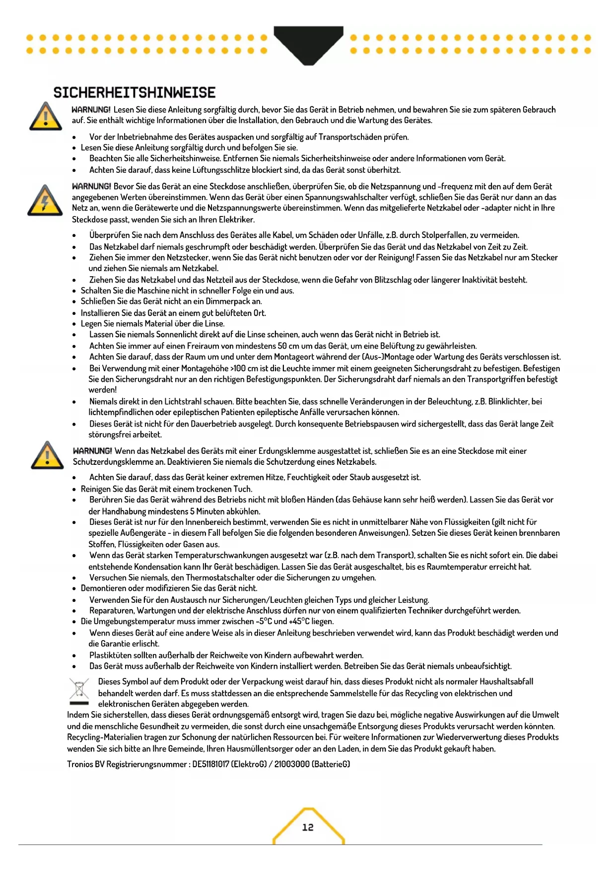 Controleer de softwareversie en foutmeldingen van het apparaat voor meer informatie. Neem contact op met Beamz Support of Beamz geautoriseerde servicepartner. Geen lichtopbrengst of licht valt met tussenpozen uit. . Apparaat te warm. Laat het apparaat afkoelen. Verlaag de omgevingstemperatuur. Zorg voor een vrije luchtstroom rond het apparaat. Reinig het apparaat indien nodig. LED's defect Ontkoppel het apparaat en neem contact op met de Beamz Support of met een door Beamz geautoriseerde servicepartner. Instellingen van de voedingsspanning komen niet overeenkomen met de lokale wisselspanning en frequentie. Ontkoppel het apparaat. Controleer de instellingen en corrigeer mogelijke foutenLesen Sie diese Anleitung sorgfältig durch, bevor Sie das Gerät in Betrieb nehmen, und bewahren Sie sie zum späteren Gebrauch auf. Sie enthält wichtige Informationen über die Installation, den Gebrauch und die Wartung des Gerätes. Vor der Inbetriebnahme des Gerätes auspacken und sorgfältig auf Transportschäden prüfen. Lesen Sie diese Anleitung sorgfältig durch und befolgen Sie sie. Beachten Sie alle Sicherheitshinweise. Entfernen Sie niemals Sicherheitshinweise oder andere Informationen vom Gerät. Achten Sie darauf, dass keine Lüftungsschlitze blockiert sind, da das Gerät sonst überhitzt. Bevor Sie das Gerät an eine Steckdose anschließen, überprüfen Sie, ob die Netzspannung und -frequenz mit den auf dem Gerät angegebenen Werten übereinstimmen. Wenn das Gerät über einen Spannungswahlschalter verfügt, schließen Sie das Gerät nur dann an das Netz an, wenn die Gerätewerte und die Netzspannungswerte übereinstimmen. Wenn das mitgelieferte Netzkabel oder -adapter nicht in Ihre Steckdose passt, wenden Sie sich an Ihren Elektriker. Überprüfen Sie nach dem Anschluss des Gerätes alle Kabel, um Schäden oder Unfälle, z.B. durch Stolperfallen, zu vermeiden. Das Netzkabel darf niemals geschrumpft oder beschädigt werden. Überprüfen Sie das Gerät und das Netzkabel von Zeit zu Zeit. Ziehen Sie immer den Netzstecker, wenn Sie das Gerät nicht benutzen oder vor der Reinigung! Fassen Sie das Netzkabel nur am Stecker und ziehen Sie niemals am Netzkabel. Ziehen Sie das Netzkabel und das Netzteil aus der Steckdose, wenn die Gefahr von Blitzschlag oder längerer Inaktivität besteht. Schalten Sie die Maschine nicht in schneller Folge ein und aus. Schließen Sie das Gerät nicht an ein Dimmerpack an. Installieren Sie das Gerät an einem gut belüfteten Ort. Legen Sie niemals Material über die Linse. Lassen Sie niemals Sonnenlicht direkt auf die Linse scheinen, auch wenn das Gerät nicht in Betrieb ist. Achten Sie immer auf einen Freiraum von mindestens 50 cm um das Gerät, um eine Belüftung zu gewährleisten. Achten Sie darauf, dass der Raum um und unter dem Montageort während der (Aus-)Montage oder Wartung des Geräts verschlossen ist. Bei Verwendung mit einer Montagehöhe >100 cm ist die Leuchte immer mit einem geeigneten Sicherungsdraht zu befestigen. Befestigen Sie den Sicherungsdraht nur an den richtigen Befestigungspunkten. Der Sicherungsdraht darf niemals an den Transportgriffen befestigt werden! Niemals direkt in den Lichtstrahl schauen. Bitte beachten Sie, dass schnelle Veränderungen in der Beleuchtung, z.B. Blinklichter, bei lichtempfindlichen oder epileptischen Patienten epileptische Anfälle verursachen können. Dieses Gerät ist nicht für den Dauerbetrieb ausgelegt. Durch konsequente Betriebspausen wird sichergestellt, dass das Gerät lange Zeit störungsfrei arbeitet. Wenn das Netzkabel des Geräts mit einer Erdungsklemme ausgestattet ist, schließen Sie es an eine Steckdose mit einer Schutzerdungsklemme an. Deaktivieren Sie niemals die Schutzerdung eines Netzkabels. Achten Sie darauf, dass das Gerät keiner extremen Hitze, Feuchtigkeit oder Staub ausgesetzt ist. Reinigen Sie das Gerät mit einem trockenen Tuch. Berühren Sie das Gerät während des Betriebs nicht mit bloßen Händen (das Gehäuse kann sehr heiß werden). Lassen Sie das Gerät vor der Handhabung mindestens 5 Minuten abkühlen. Dieses Gerät ist nur für den Innenbereich bestimmt, verwenden Sie es nicht in unmittelbarer Nähe von Flüssigkeiten (gilt nicht für spezielle Außengeräte - in diesem Fall befolgen Sie die folgenden besonderen Anweisungen). Setzen Sie dieses Gerät keinen brennbaren Stoffen, Flüssigkeiten oder Gasen aus. Wenn das Gerät starken Temperaturschwankungen ausgesetzt war (z.B. nach dem Transport), schalten Sie es nicht sofort ein. Die dabei entstehende Kondensation kann Ihr Gerät beschädigen. Lassen Sie das Gerät ausgeschaltet, bis es Raumtemperatur erreicht hat. Versuchen Sie niemals, den Thermostatschalter oder die Sicherungen zu umgehen. Demontieren oder modifizieren Sie das Gerät nicht. Verwenden Sie für den Austausch nur Sicherungen/Leuchten gleichen Typs und gleicher Leistung. Reparaturen, Wartungen und der elektrische Anschluss dürfen nur von einem qualifizierten Techniker durchgeführt werden. Die Umgebungstemperatur muss immer zwischen -5°C und +45°C liegen. Wenn dieses Gerät auf eine andere Weise als in dieser Anleitung beschrieben verwendet wird, kann das Produkt beschädigt werden und die Garantie erlischt. Plastiktüten sollten außerhalb der Reichweite von Kindern aufbewahrt werden. Das Gerät muss außerhalb der Reichweite von Kindern installiert werden. Betreiben Sie das Gerät niemals unbeaufsichtigt. Dieses Symbol auf dem Produkt oder der Verpackung weist darauf hin, dass dieses Produkt nicht als normaler Haushaltsabfall behandelt werden darf. Es muss stattdessen an die entsprechende Sammelstelle für das Recycling von elektrischen und elektronischen Geräten abgegeben werden. Indem Sie sicherstellen, dass dieses Gerät ordnungsgemäß entsorgt wird, tragen Sie dazu bei, mögliche negative Auswirkungen auf die Umwelt und die menschliche Gesundheit zu vermeiden, die sonst durch eine unsachgemäße Entsorgung dieses Produkts verursacht werden könnten. Recycling-M