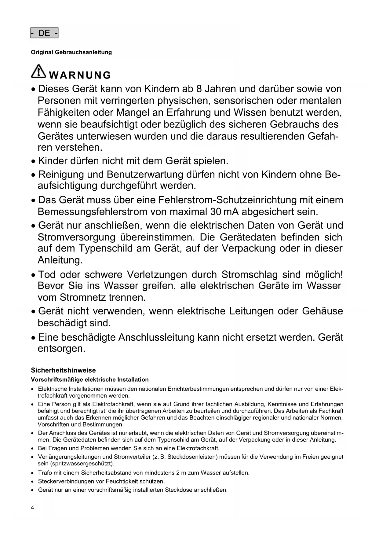 - Bevor Sie ins Wasser greifen, Netzspannung aller im Wasser befindlichen Geräte abschalten.