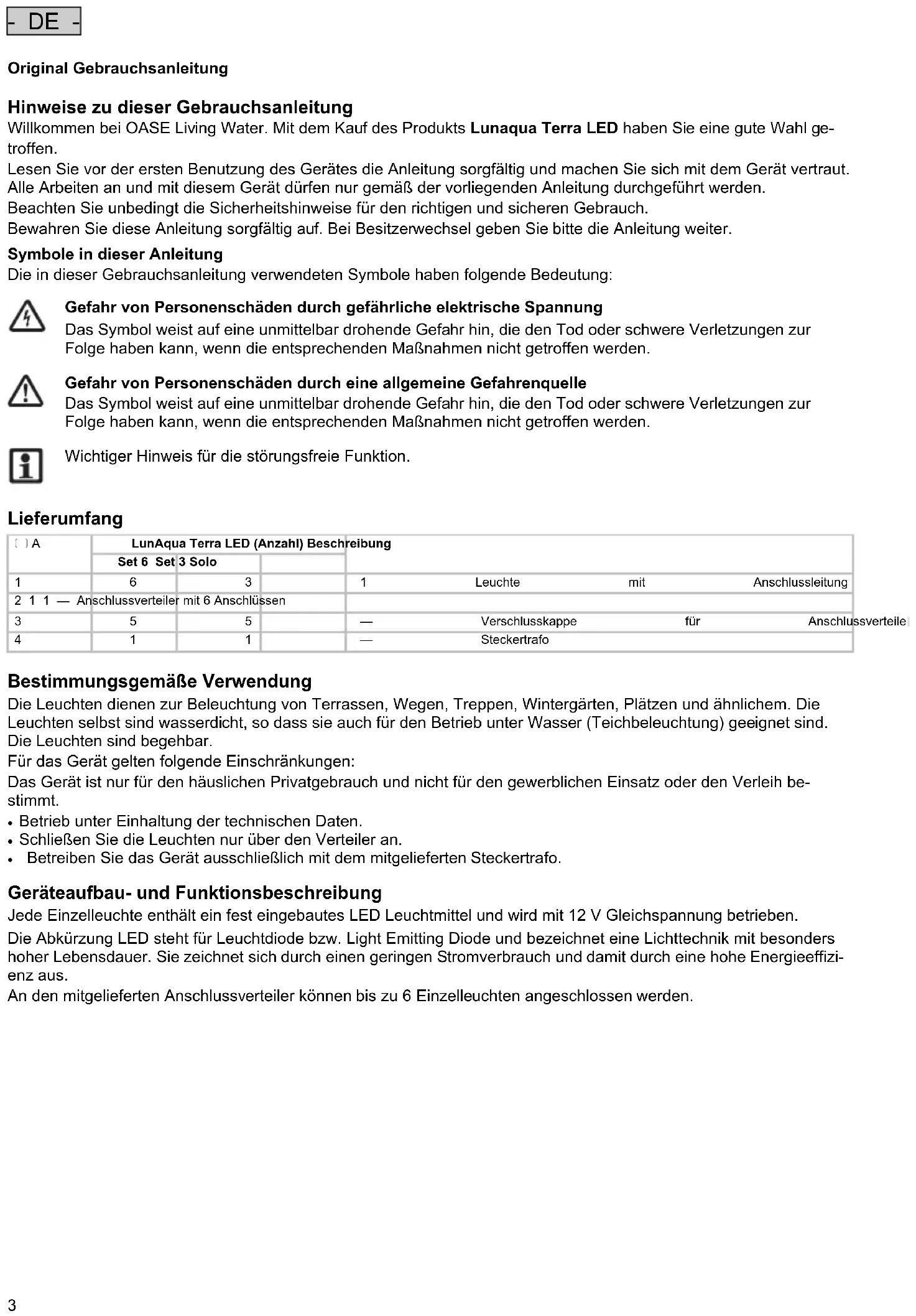- DE - Original Gebrauchsanleitung Hinweise zu dieser Gebrauchsanleitung Willkommen bei OASE Living Water. Mit dem Kauf des Produkts Lunaqua Terra LED haben Sie eine gute Wahl ge- troffen. Lesen Sie vor der ersten Benutzung des Gerätes die Anleitung sorgfältig und machen Sie sich mit dem Gerät vertraut. Alle Arbeiten an und mit diesem Gerät dürfen nur gemäß der vorliegenden Anleitung durchgeführt werden. Beachten Sie unbedingt die Sicherheitshinweise für den richtigen und sicheren Gebrauch. Bewahren Sie diese Anleitung sorgfältig auf. Bei Besitzerwechsel geben Sie bitte die Anleitung weiter. Symbole in dieser Anleitung Die in dieser Gebrauchsanleitung verwendeten Symbole haben folgende Bedeutung:
